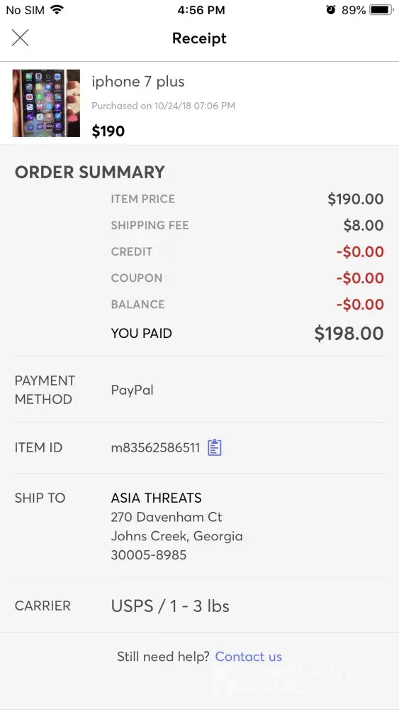 I ordered a phone from this website but when I received it, the package was already opened and badly packed. When I looked at the phone it was cracked badly. After the 3 days the seller stopped responding. I want a refund. I made a case with my credit card company and they gave em the money back temporally but it needs mercari to respond. This all happened in october 27th. I provide pictures of the shipping delivery address, phone, and the message between me and the seller.