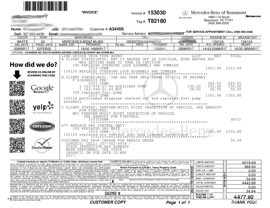Mercedes Benz jerry rigged my car! They did NOT fix it. It makes NO SENSE that they don't want to take pride in their work, but I DO KNOW that they did stuff so OTHER STUFF would happen and they'd try to BLAME ME for more and CHARGE ME for more to get out of their warranty!