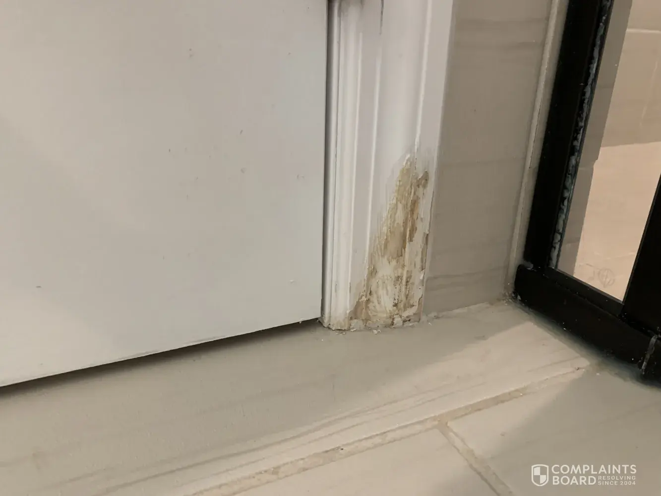 We purchased a home in Oakland Fl Meritage Homes. We noticed after about two years a moldy smell in our master bathroom. Then we began to notice a warping and yellow stain on our baseboards by the master tub. We started looking under the sink to see if we had a leak and noticed the entire sink cabinet was destroyed from water damage under the base. This is the cabinet next to the tub.