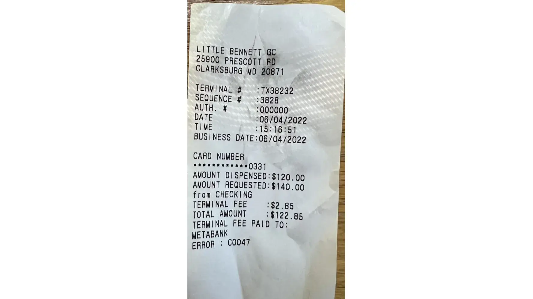 I had $140 cash requested to ATM at Little Bennett Golf Club on 6/4/22 , but received only $120 due to run out of money and charged my bank fully($140). See the photo for more details