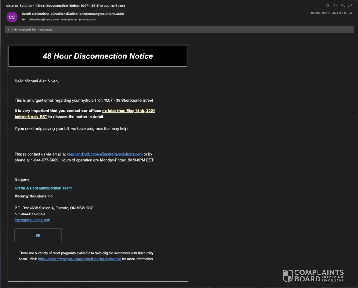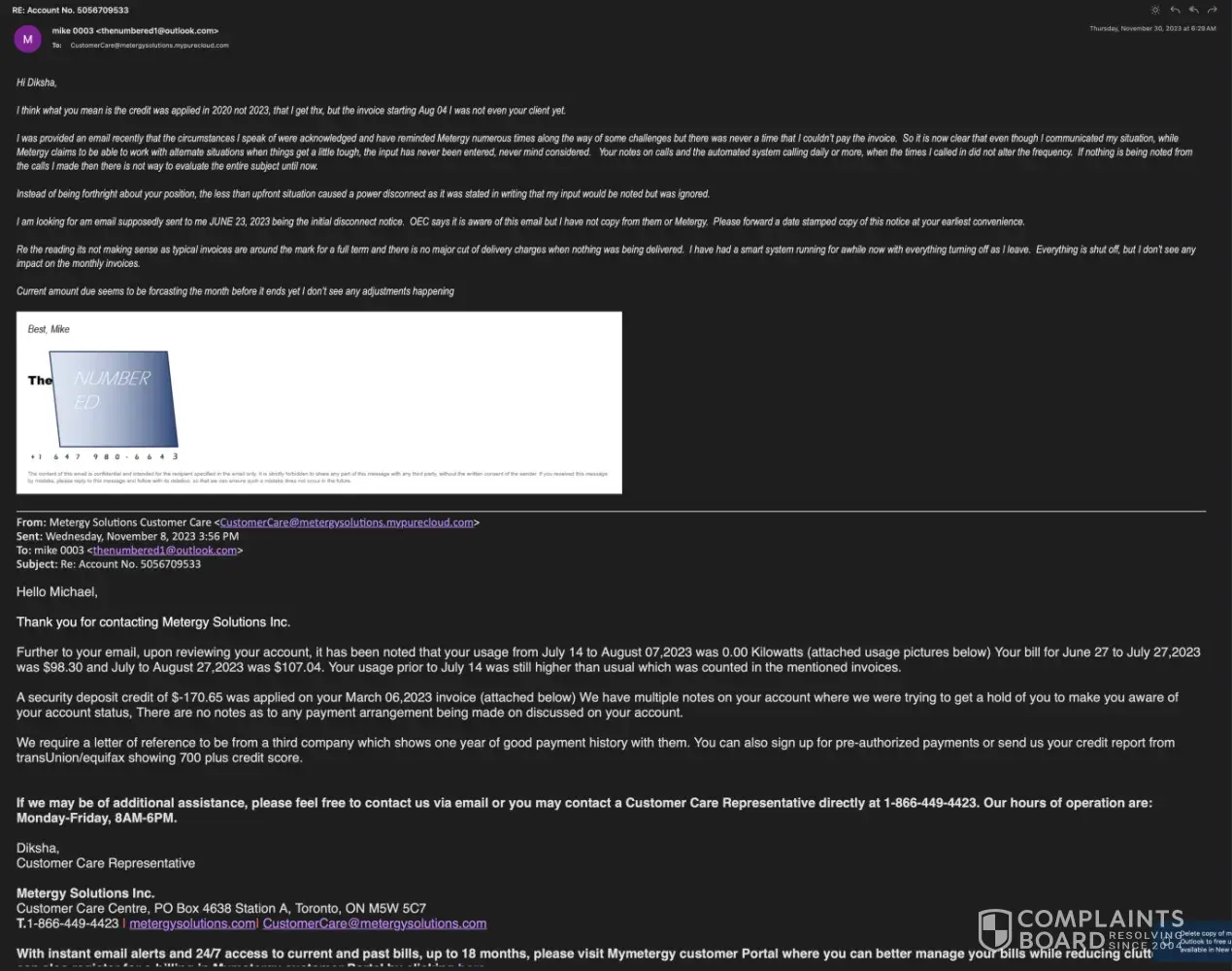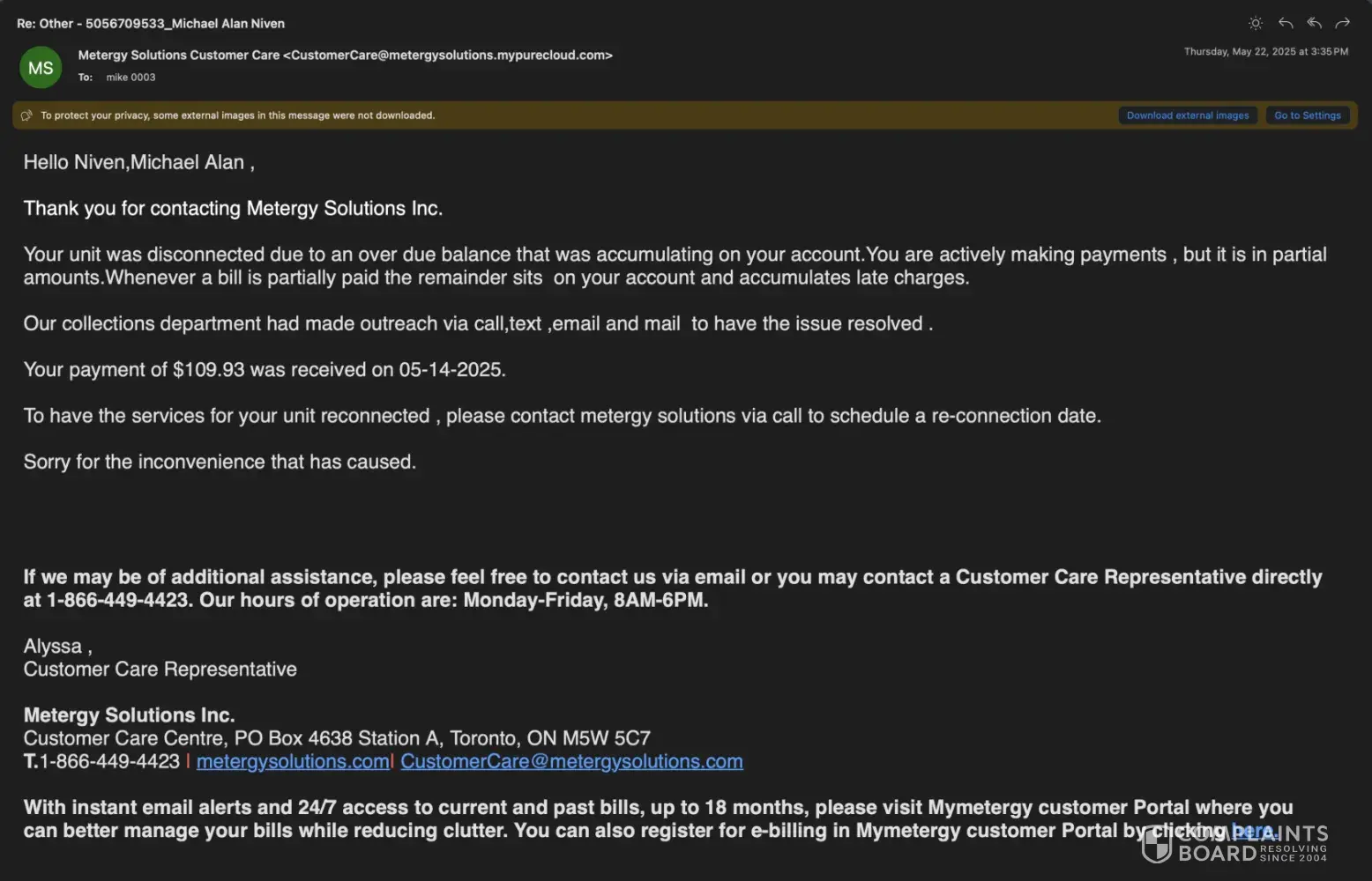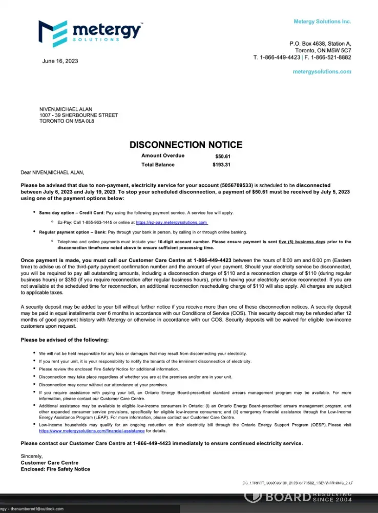 Metergy is the contracted service for our condo building. End of April i was in fact sent a 2 week disconnection notice, the sole venue used for these types of notices as per their polices is by mail. They sent it to the wrong address. Portal allows for a mailing address and they used the service address which i do not check often. it is essentially closed for too much junk mail distributed in the area. With no clue there was an issue and as i was current in my payments. On May 13th this year was sent a 2 day notice, by email, I received it at 3pm, missed it but had prepared payment on May 14th in the evening. on May 15th my unit was disconnected about 5 hours before the expiration of the 48 hour notice.The notice says nothing about disconnection and to make contact before 6pm that day, which I did by email. it is typcial to have to wait if you phone, so sent an email about the power and that a payment was sent the day before sent the receipts as well, nothing. Friday. i received and answer to the email from customer service tthat the payment was made on the 14th, and to assist me in setting up the account, this was on Friday at 6pm, so not power for the weekend. the current invoice was not due until the 29the but there was a carried non payment for when they did the same thing last summer, I have tried to talk to them about it, sent my back up, no reponse. I come back to this. I had tried several times to call in, every time there was a long cue and every time took the option for a callback but never got one. Was communicating through email and customer care continuslaly asking about reconnection and informing them that the errors of not following their policies is the reason for the cut off. it was on day 14 that an email sent and a human called back and put me through to credit to schedule a reconnection. First woman hung up on me, more confused than anything as she put me on hold then hung up. She did confirm that the portal was down completely as i was trying to determine the may 29th payment for any balances, 14th, 23rd and 31st. payments were sent, and ended up overpaying the account which they deducted a disconnection fee, because they cut it too early. have already argued the point and was working with OEB, they never ask for back up. The after i set up reconnection, OEB reaches out that it is resolved and the connection is set up, and suggests i apply for financial assistance. So this time they sent me a notice to the wrong documented address, cut off power after a payment was made, and the agent that turned off the meter never came to my door, and i know this as i was workng in my office beside the entry.and dont follow the information on teh 48 hours notice at all, which i did. Throughout the 14 days agents would come back with points listed in policies that justified the disconnection, like the notice was sent but to the wrong address. Their involvement at each stage seemed more about invoicing a charge than helping get reonnected, so for that time basically had no. power, no lights, was charging battery packs constantly etc.. for 14 days. For the disonnection they claim, there was not info on the charge, and a weird amount on my profile, which only started to wokk but payment history was missing and a credit note. Without my knowlecge they just kept the extra funds and put through the first have of the charge. Last June or july same thing happened, they sent me a notice then a 48 hours notice and as i was way disconnected the power. Why this occured is that being self employed, my checks are irregular, so I phone them to tell them about it and i may miss some due dates, and I did. They told me that they noted my account, once verbally and twice in writing yet there were never any notes on the matter. When the became extremely aggressive, 13 texts in one week, I call in to find out there is not notes, even asked to see my file to verify what s on the file. ignored. this incident was so grossly misleading , they caught a time to issue the disconnection ..I was working with OEB, end expected the charge to show up on teh next invoice, but the response OEB was lame and not well investigated, basically receiving Metergy s version and going with that, and both times e i had back up. which they didn't want. I told OEB that my extra check was confiscated, and inquired if they were ending at their resolution or do they continue with the complaint. No answer. Essentially this is a monopoly and they have a contract which they made with the developer and we are stuck with this company until next year, they own the meters as well. so i guess they think they can do what they want. As per their policies, I did not break any of them, while they didnt adhere to them. i might just move.