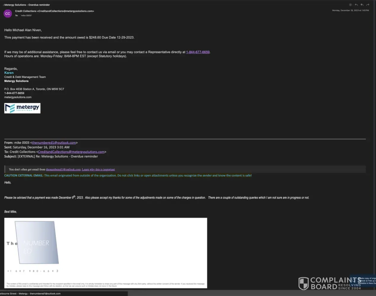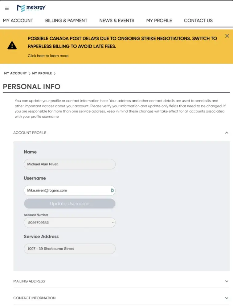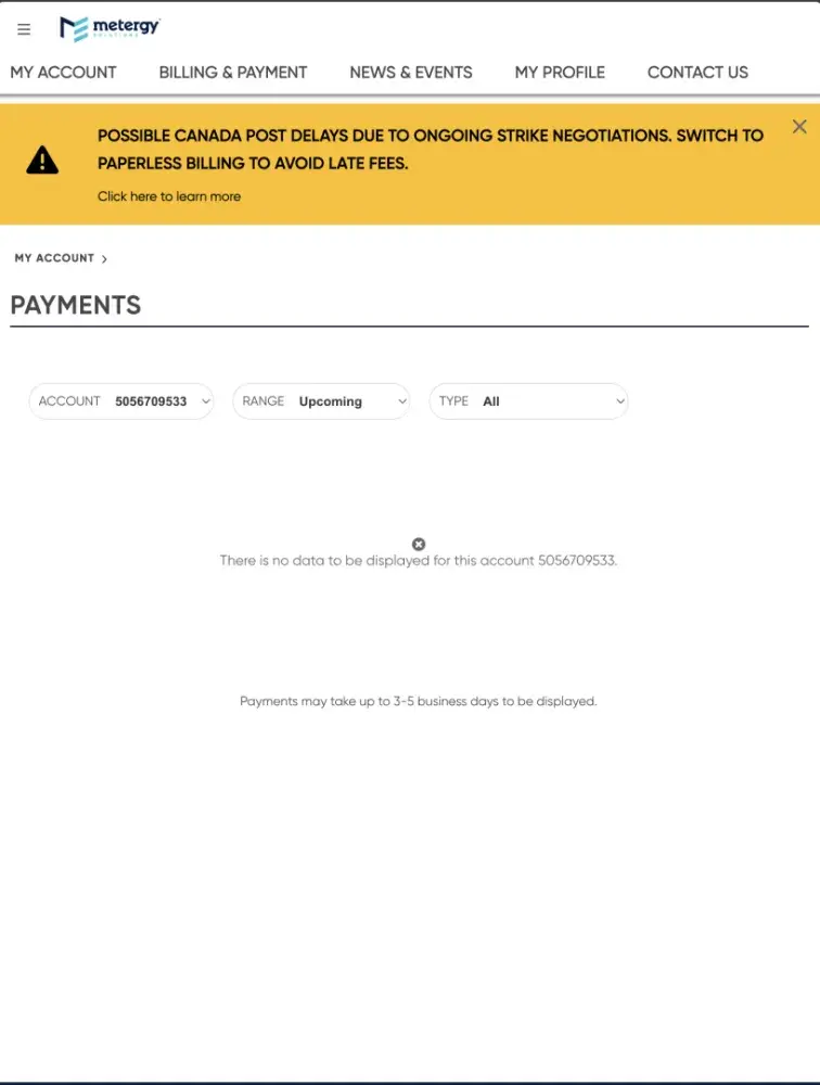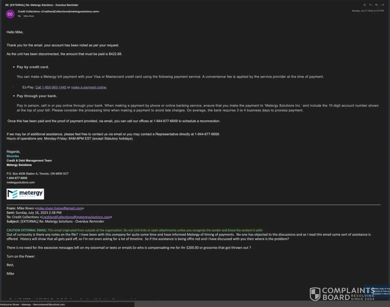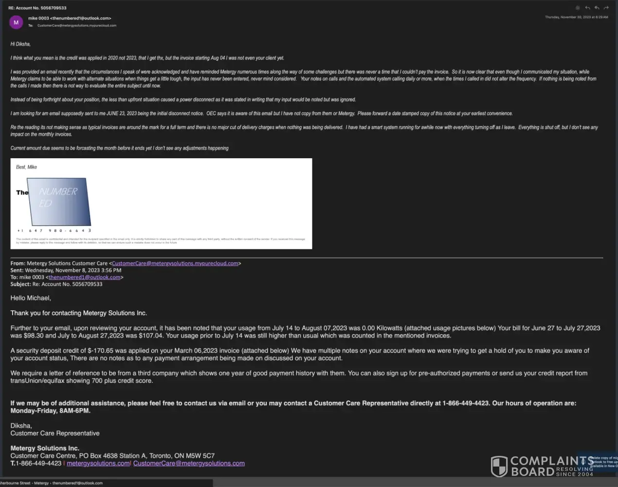 Metergy is the contracted service for our condo building. End of April i was in fact sent a 2 week disconnection notice, the sole venue used for these types of notices as per their polices is by mail. They sent it to the wrong address. Portal allows for a mailing address and they used the service address which i do not check often. it is essentially closed for too much junk mail distributed in the area. With no clue there was an issue and as i was current in my payments. On May 13th this year was sent a 2 day notice, by email, I received it at 3pm, missed it but had prepared payment on May 14th in the evening. on May 15th my unit was disconnected about 5 hours before the expiration of the 48 hour notice.The notice says nothing about disconnection and to make contact before 6pm that day, which I did by email. it is typcial to have to wait if you phone, so sent an email about the power and that a payment was sent the day before sent the receipts as well, nothing. Friday. i received and answer to the email from customer service tthat the payment was made on the 14th, and to assist me in setting up the account, this was on Friday at 6pm, so not power for the weekend. the current invoice was not due until the 29the but there was a carried non payment for when they did the same thing last summer, I have tried to talk to them about it, sent my back up, no reponse. I come back to this. I had tried several times to call in, every time there was a long cue and every time took the option for a callback but never got one. Was communicating through email and customer care continuslaly asking about reconnection and informing them that the errors of not following their policies is the reason for the cut off. it was on day 14 that an email sent and a human called back and put me through to credit to schedule a reconnection. First woman hung up on me, more confused than anything as she put me on hold then hung up. She did confirm that the portal was down completely as i was trying to determine the may 29th payment for any balances, 14th, 23rd and 31st. payments were sent, and ended up overpaying the account which they deducted a disconnection fee, because they cut it too early. have already argued the point and was working with OEB, they never ask for back up. The after i set up reconnection, OEB reaches out that it is resolved and the connection is set up, and suggests i apply for financial assistance. So this time they sent me a notice to the wrong documented address, cut off power after a payment was made, and the agent that turned off the meter never came to my door, and i know this as i was workng in my office beside the entry.and dont follow the information on teh 48 hours notice at all, which i did. Throughout the 14 days agents would come back with points listed in policies that justified the disconnection, like the notice was sent but to the wrong address. Their involvement at each stage seemed more about invoicing a charge than helping get reonnected, so for that time basically had no. power, no lights, was charging battery packs constantly etc.. for 14 days. For the disonnection they claim, there was not info on the charge, and a weird amount on my profile, which only started to wokk but payment history was missing and a credit note. Without my knowlecge they just kept the extra funds and put through the first have of the charge. Last June or july same thing happened, they sent me a notice then a 48 hours notice and as i was way disconnected the power. Why this occured is that being self employed, my checks are irregular, so I phone them to tell them about it and i may miss some due dates, and I did. They told me that they noted my account, once verbally and twice in writing yet there were never any notes on the matter. When the became extremely aggressive, 13 texts in one week, I call in to find out there is not notes, even asked to see my file to verify what s on the file. ignored. this incident was so grossly misleading , they caught a time to issue the disconnection ..I was working with OEB, end expected the charge to show up on teh next invoice, but the response OEB was lame and not well investigated, basically receiving Metergy s version and going with that, and both times e i had back up. which they didn't want. I told OEB that my extra check was confiscated, and inquired if they were ending at their resolution or do they continue with the complaint. No answer. Essentially this is a monopoly and they have a contract which they made with the developer and we are stuck with this company until next year, they own the meters as well. so i guess they think they can do what they want. As per their policies, I did not break any of them, while they didnt adhere to them. i might just move.