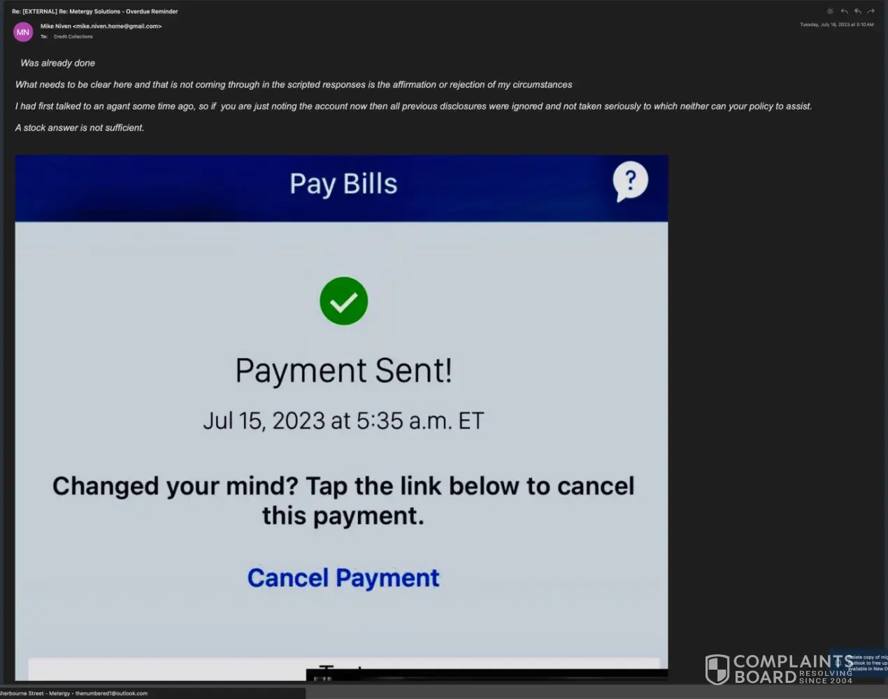 I own a condo unit downtown. A tenant hasn't set up his hydro account, so I told METERGY Solutions to stop my auto payments. They paused a payment, then charged double the next cycle, taking $700 from me. After calls, a supervisor responded, but they won't refund me. My account is with Metergy.