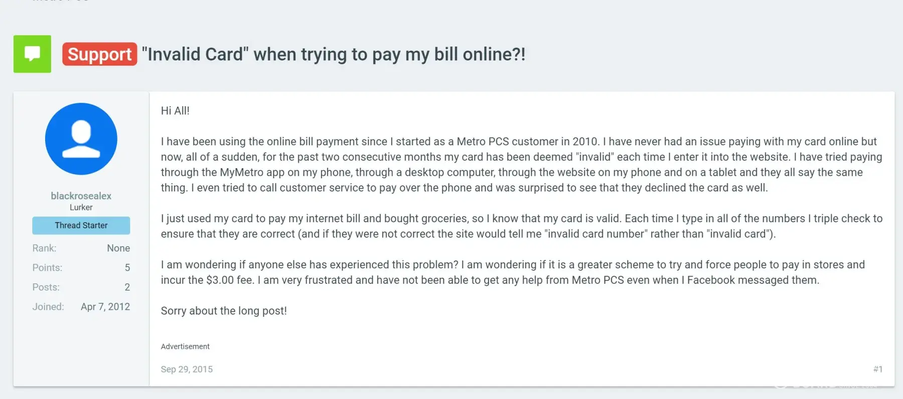 Please go to: The Federal Trade Commission Website and report MetroPCS for scamming their customers by charging a $3 fee to simply pay their bill in person and their online service doesn't accept all cards.