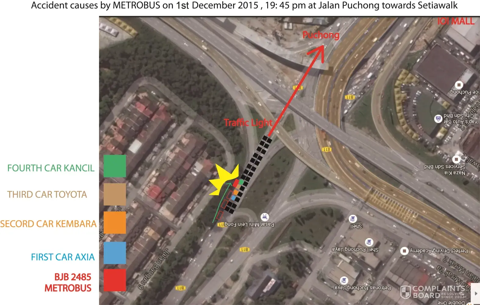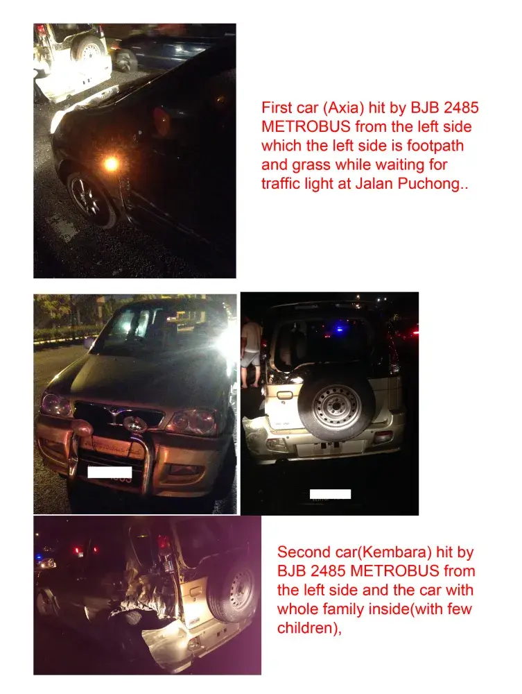 1/12/2015 7:45pm, I was driving from home towards Setiawalk, tired being stuck in a traffic jam. Suddenly, I heard a loud bang beside me on my left side and I saw a Metrobus appeared from no-where, crashing all the cars start from me and bear in mind we were all waiting at the traffic light, the line was not moving and I have no way to run, and yes, I (and those few cars in front of me) being hit badly by this bus. Calmed down from the after-shock, I came down from the car while all the other drivers start questioning the Metrobus driver. I looked at the damaged side of my car. Both my left front and back doors are severely damaged, left side mirror was lost from its place, I couldn’t bear another second looking at it. It was only my first car that I’ve only drove for the past one and only month! Anger came in when I realized that there is only grass path from the side where my car being hit. There is no road and no way for a car even a bike could possibly squeeze in, and that is definitely a big huge NO for a bus! I have no idea where the bus came from and what was in the driver’s mind. What was the bus driver doing? Was he fall asleep? Was he in a rush? Was he not noticed there is no road for him? Was he being robber in the bus? I couldn’t think. We all have had the bad experiences from public buses where some of the drivers use to drive recklessly, cutting queue, changing lane without putting on a signal light (or signal flashed for 0.001 second right before they changed their lane and forced all the other cars behind to halt), they put all the road users’ lives in threat and danger! I couldn’t imagine if I was one of the passengers on the bus, imagine the shock and shout. Looking at the second car right in front of mine was a Kembara. The left back corner was damaged and I saw a family of 5 sitting inside. Again I couldn’t dare to imagine if the case gone worst. I hereby demand for an explain from Metrobus, on how the company trained and selected the bus drivers, looking at the fact most of the Malaysian road users have negative impressions for your bus services. METROBUS still not yet contact victims for any reparation! So end up with nothing definite?