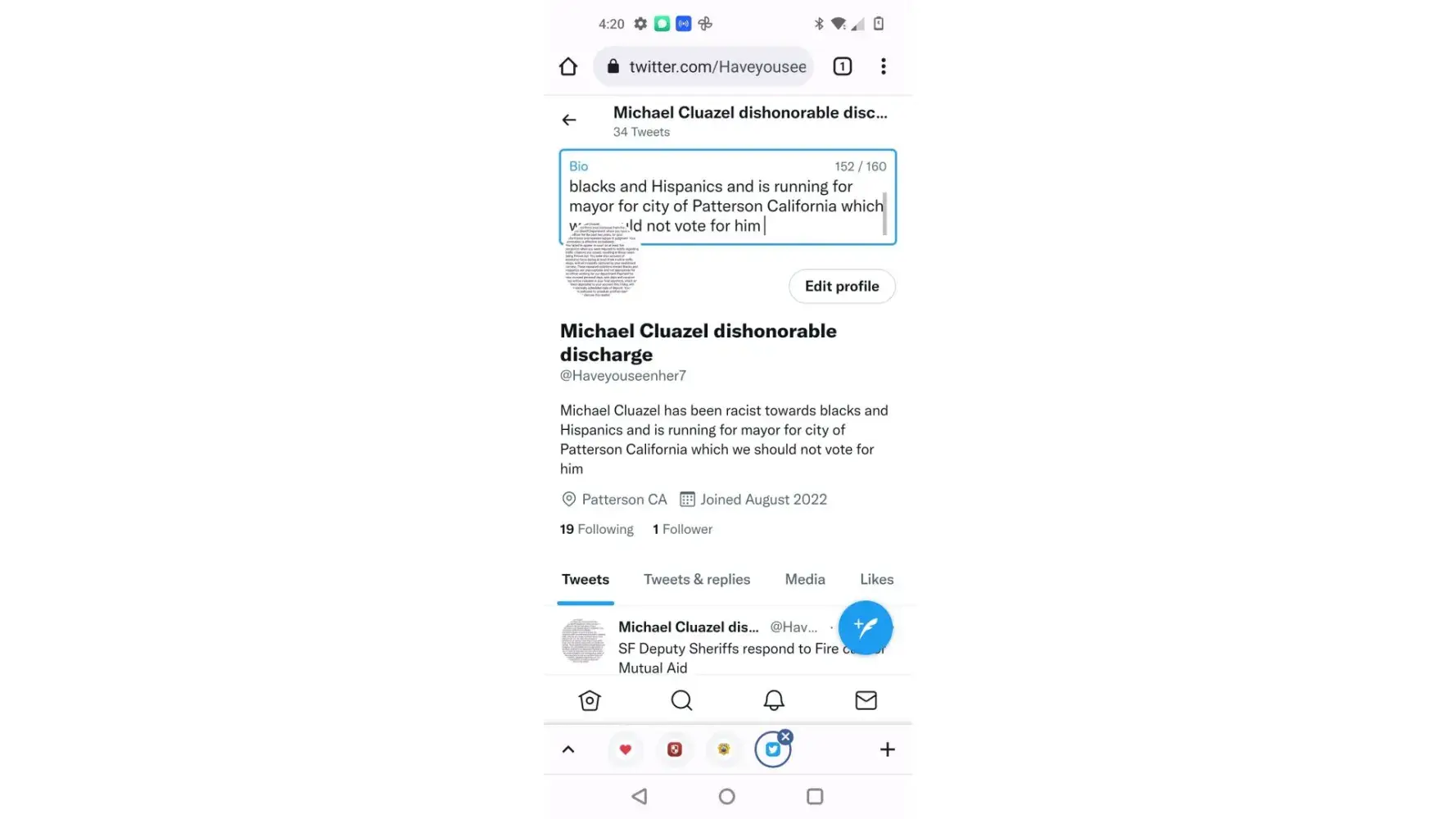 Michael Cluazel from Patterson CA running for Mayor is racist towards blacks and Hispanics do not vote for him as a Mayor