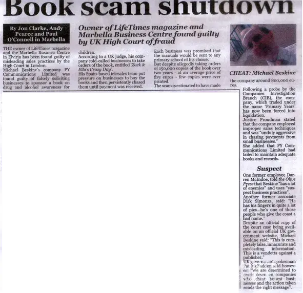Donald Beskine was prosecuted in England for a book scam which lost small businesses a total of 800.000 Pounds.