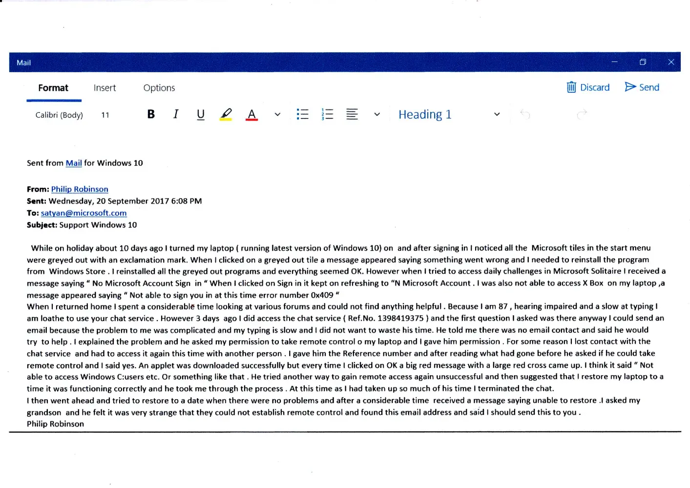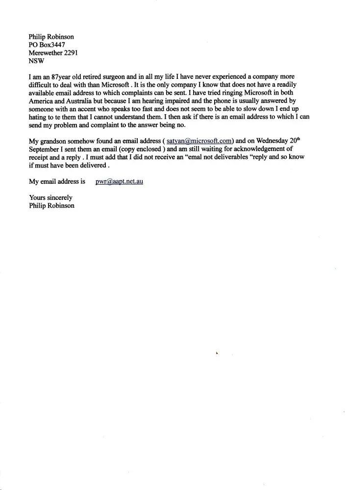 I am attaching an email sent to [protected]@microsoft.com on the 20/9/17 .I have not had a reply . Attached is also a copy of a letter I sent to Microsoft Pty.Ltd PO Box 91 North Ryde NSW 1670. I have not had a reply to this let. I was considering putting this matter in the hands of the NSW Ombudsman but decided I would send you an official complaint