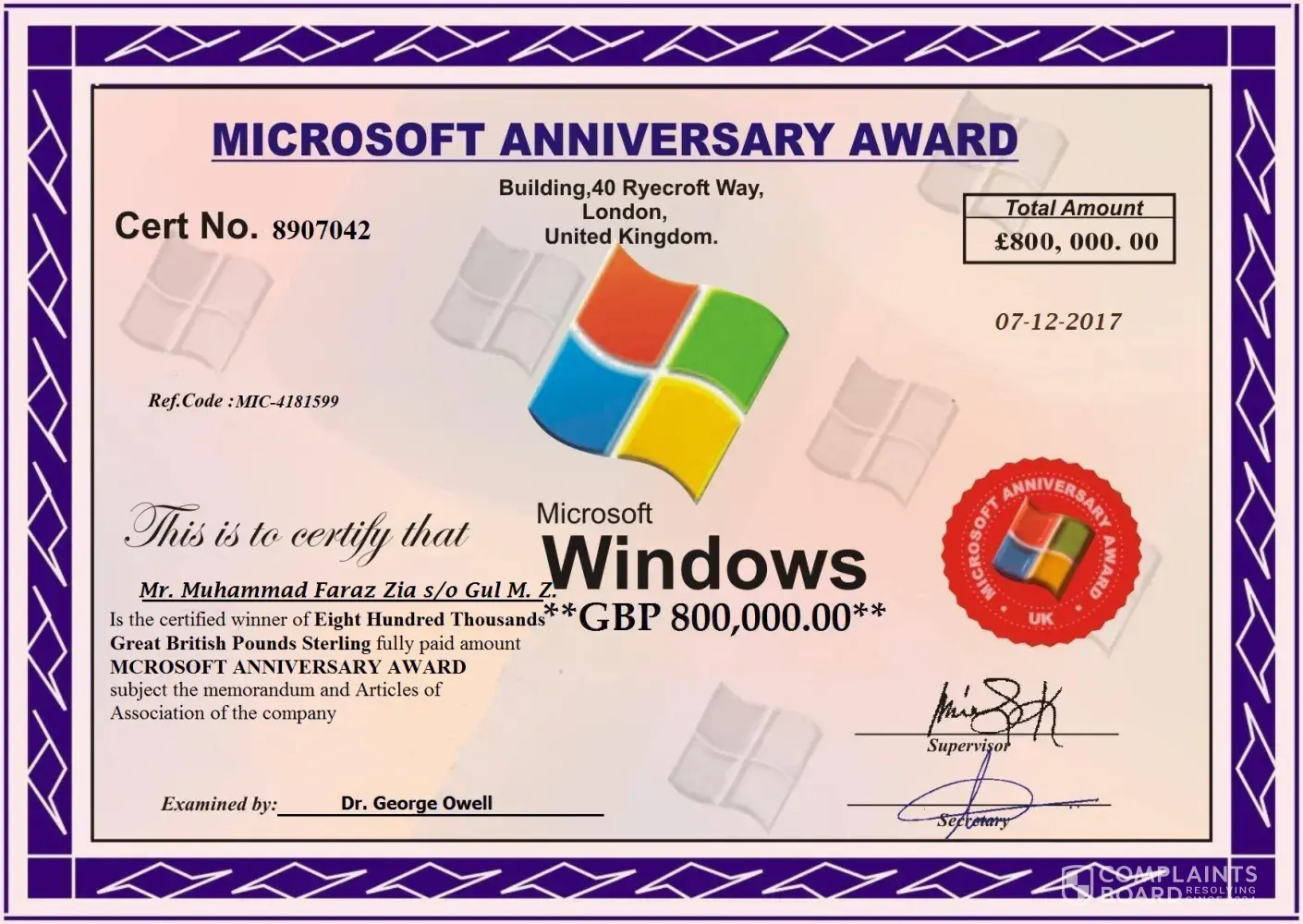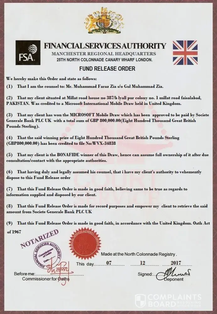 Seven (7) people were selected on this draw to benefit from the 2018 Microsoft Anniversary promotion draw and you are one of the Selected Winners to claim a cash prize of £800, 000.00 Pounds.