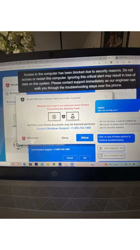 September 1,2022 I my laptop preview a message in writing and with sound. the message stated that hackers had got in my computer and do not turn off. one of the messages read All files and online accounts may be banned permanently. contact Windows Support @ [protected]. All so it read Access to the computer has been Blocked due to security reasons. Do not access or restart this computer. The message continued how I called the number believing that Windows was trying to assist me. However, google provided location for the telephone number that I callled showing a picture of location. Ok by now you know that I'm not that computer savvy. The information requested was to remote into my computer and they show my IP address with a list of hacker on my system a lot stating, ESTABLISHED. Well it seemed ok, it read After the operation completes,the tool will provide you with a report of the malicious software that was detected. Believing that I was talking with Microsoft rep. which voice of Asian, Chinses, well foreign speaking was possibly the company rep. However, I called another number for Microsoft and the same procedure was provided. This time the same voices but they told my not to shut down. How come it's so difficult to get help from the make of these product that we have purchased here in the United States. I'm confused who the help come from more Now than ever had to be. Is it Microsoft responsibility to provide protection from these hackers trying and becoming very much successful with my information? It will take years for me to correct successful Hackers criminal activity. I'm not able to purchase all the fire walls the our gov. have. I need help on fixing the problem of hackers having easy access to my personal information. How do we protect our information. This isn't fare that I can purchase Microsoft and not be protected for the world criminals that watches everything on my computer.