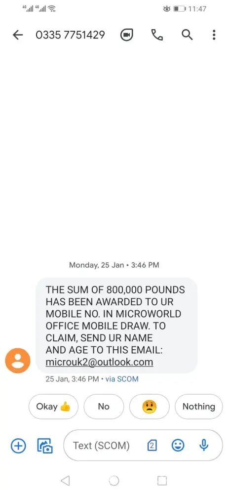 The sum of 800, 000 pounds has been awarded to ur mobile no. In microworld office mobile draw. To claim, send ur name and age to this email: [protected]@outlook.com... I want to know what is this?