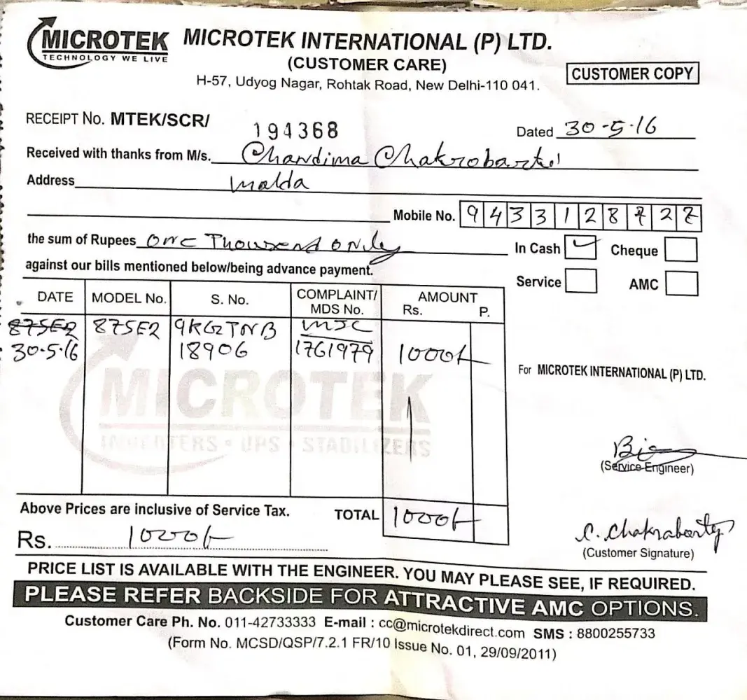 I hope Microtek authority will observe this issue with utmost importance and accordingly they will resolve the matter at their earliest. When the customer is ready to pay the listed service charge, at least the company also should also cater the brand new item.