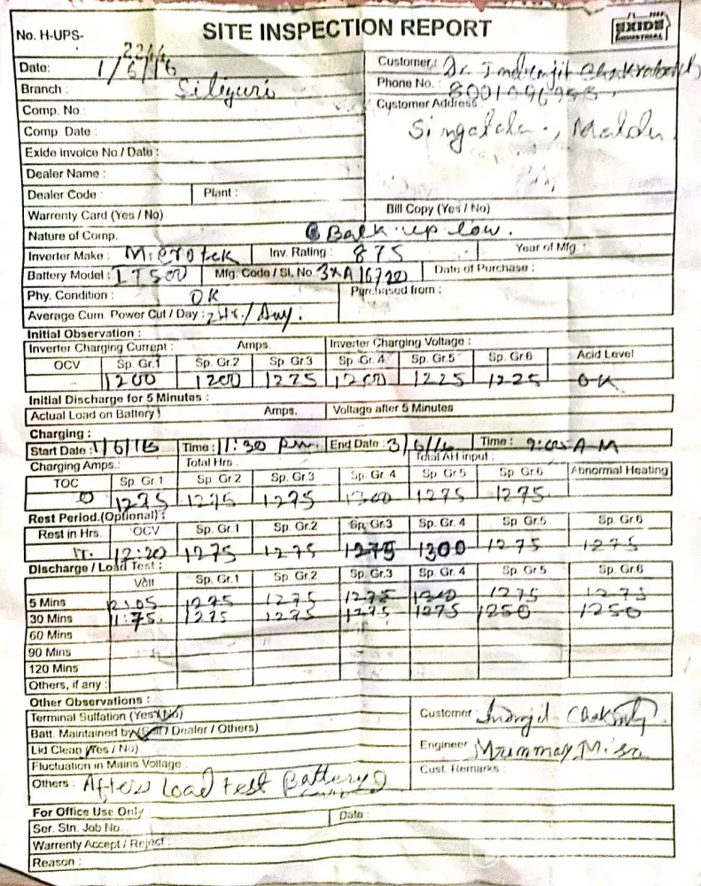 Post-replacement of this electronic board I noted that battery charging had been going for more than 24 hrs, so immediately I contacted that mechanic (Mr Halder) on 01.06.2016. He replied that it was all due to battery related problem. So accordingly I contacted "Exide" House and immediately they sent a service engineer to my residence. He came and assured me that the problem had nothing to do with the battery. However, to become 100% confirmed he gave special boosting charge for 24 hrs, even after which that problem remained as it was. He gave a detailed testing report (load test, gravity test etc) on the report card (the file attached herewith). The net result is that battery is getting charged constantly for last seven days and remained sufficiently hot round the clock - really a very alarming issue. From security point of view Microtek should take necessary steps without any further delay or lag. Accident never comes to anybody by knocking the door.