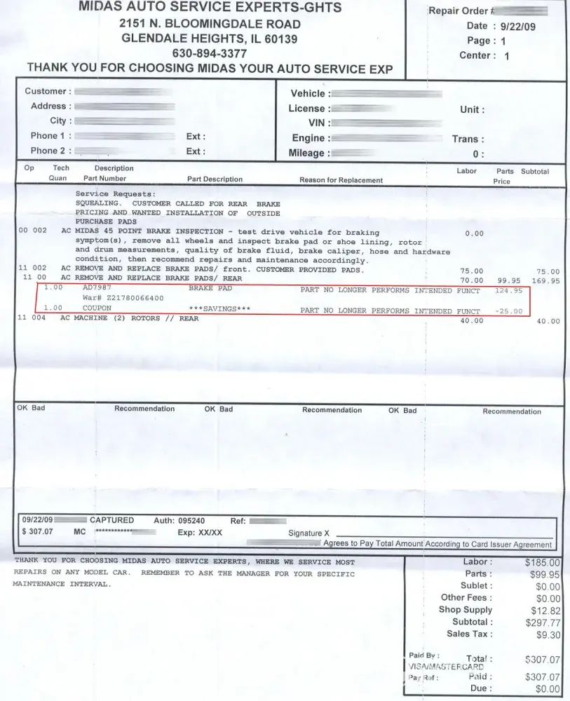 Well, their sneaky coupon bars you from using ANY advertised coupon (only "one per visit, " per the fine print)! This means you get the same competitive price as say, the OEM dealership which I would prefer due to technical expertise with the brand's own vehicle, but Midas reels you in with coupons that will NEVER, EVER work. How's that for savy and yet entirely unethical business? Ugh. And if you try to use your own coupon, they sound really generous and state they gave you an even better coupon and discount which now you know, is a complete lie that they expect you to fall for. Use a credit card if you know what I mean and never use cash at Midas "just in case".