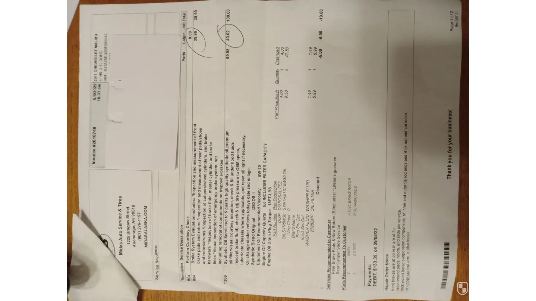 On a hot summer day 7/8/2019 ,going to do some airconditioning calls.heard noise from frontbrakes,pulled in to midas at 2390 finch ave.east.,They told me I need new brakes,I asked for an estimate,they told me it will take some time so i left the vehicle with them.asked to be called with the estimate.Three hours later I called,Jack ,the owner told me the job is done.No estimate was given.I went to see Jack surprisingly ,Iwas presented with a bill of $1794.28.I questioned the bill and was told some of the parts has lifetime warranty.I paid the bill.,On Sept.22/22,I went to my regular mechanic for an oil change and tire rotation,I also asked for a brake inspection.Iwas told the front brakes are worne out and the back brakes has about 10% left.I asked for an estimate and was given a price of$944.84 4 rotors&4 sets of pads and that I dont need calipers,they are in good shape,labour& taxes were included in this price.I went back to Midas to see if Jack can match the estimate,he said no,the best he can do is $1308.67 seeing that the pads are still under warranty and i dont need calipers.I got the job done by my regular mechanic for $944.84.