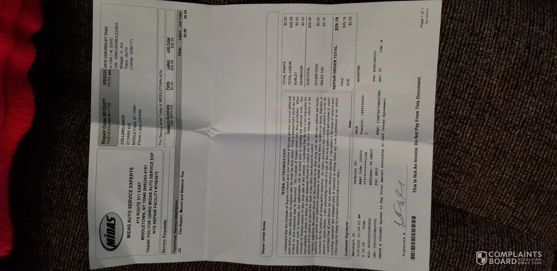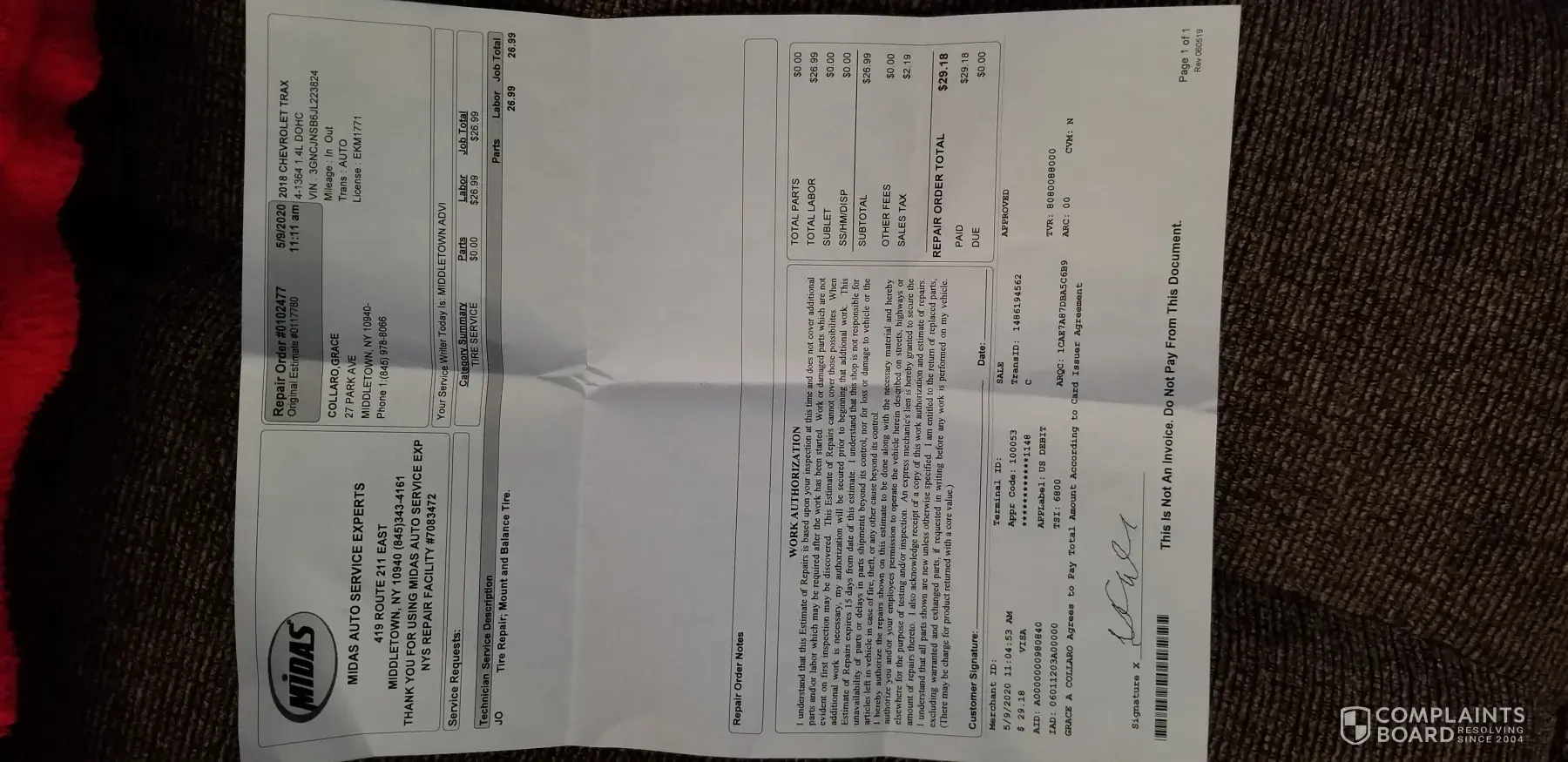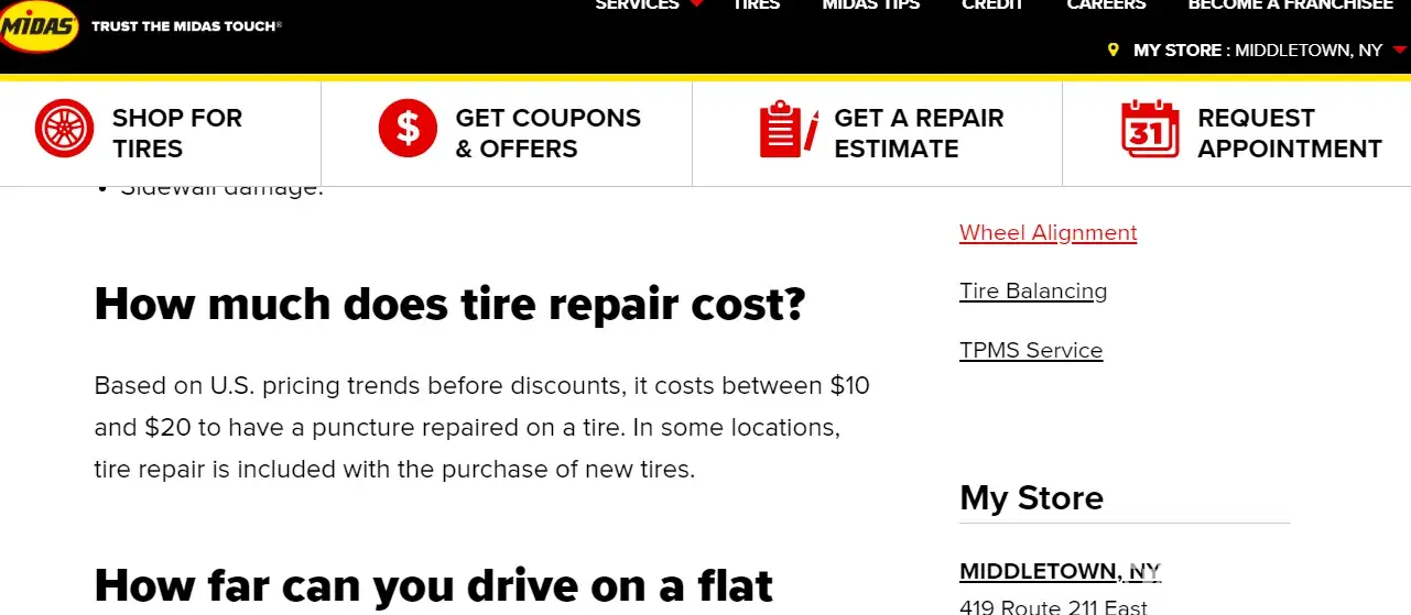 On Saturday, May 9, 2020, I stopped at the Midas in Middletown, NY Midas Auto Service Experts 419 Route 211 East Middletown, NY 10940 Repair Order #-102477 Your Service Writer Today is Middletown ADVI I stopped in the Midas shop in Middletown, NY to have them check my driver's side front tire. It was discovered that a screw had imbedded in it causing a...
