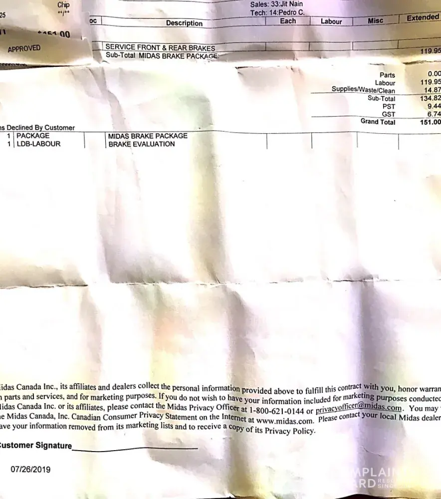 Read full complaintmidas brake package