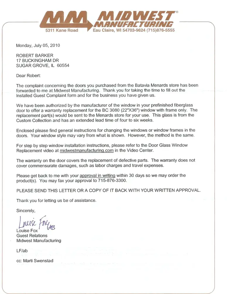 Midwest manufacturing makes mastercraft doors and sells thru menards. Long story short: we bgt five (5) mastercraft french doors for new construction. Every single one leaked horribly. Spent 4 weeks dealing with this company to return & reimburse for approx $2k in additional expenses dealing with this nightmare. Canned letters from the company saying "sorry for incovenience" "thank for your patience"... They "will be unable to offer a refund". Caution when buying special order anything thru menards and do not buy mastercraft french doors... Such poor, poor quality. You will be sorry. Learn from our expensive mistake... Contractors in our parts aptly call mastercraft= mastercrap & mastershaft. How true!