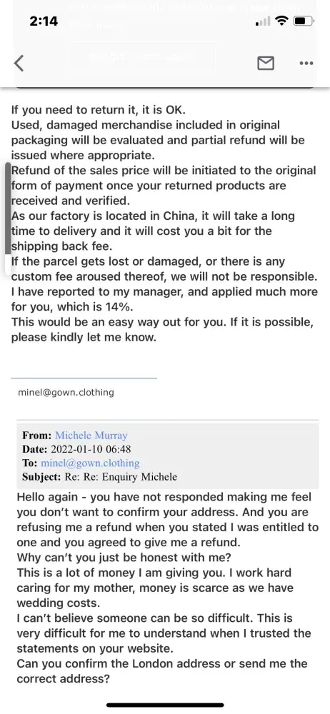 When I started to write my reviews and writing about my experience the contacted me offering 15% refund as if it is my fault that the dress is horrible... Have a look hereunder what is their answer :
