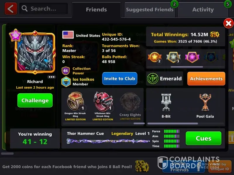 I have been playing this game for over 7 plus years I always get cheated it takes my money it glitches they have told me on numerous occasions they don't care about my complaints just don't play the game they won't reimburse me with nothing in all reality I would like to file a lawsuit with all the evidence I got... Content creators know what they are doing and this game should be shut down because real pool is not played like this