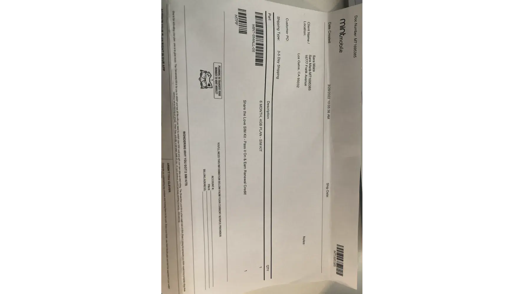 Mint Mobile - negative$51.25 Mar 9 Payment Loading transaction details for Mint Mobile - negative$51.25 Mar 9 Payment Paid with JPMORGAN CHASE BANK, NA x-1690 $51.25 Ship to Dean Da Silva "Address" 405 Poe St Quitman, TX 75783 United States Transaction ID 36515986EE457233A Seller info Mint Mobile [protected] Invoice...