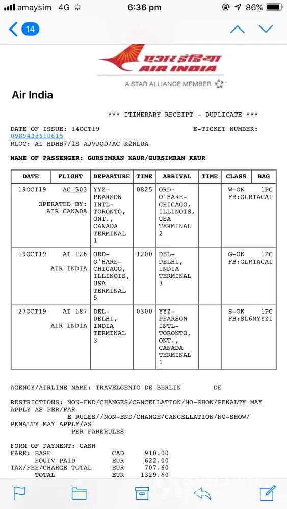 about my ticket india to canada