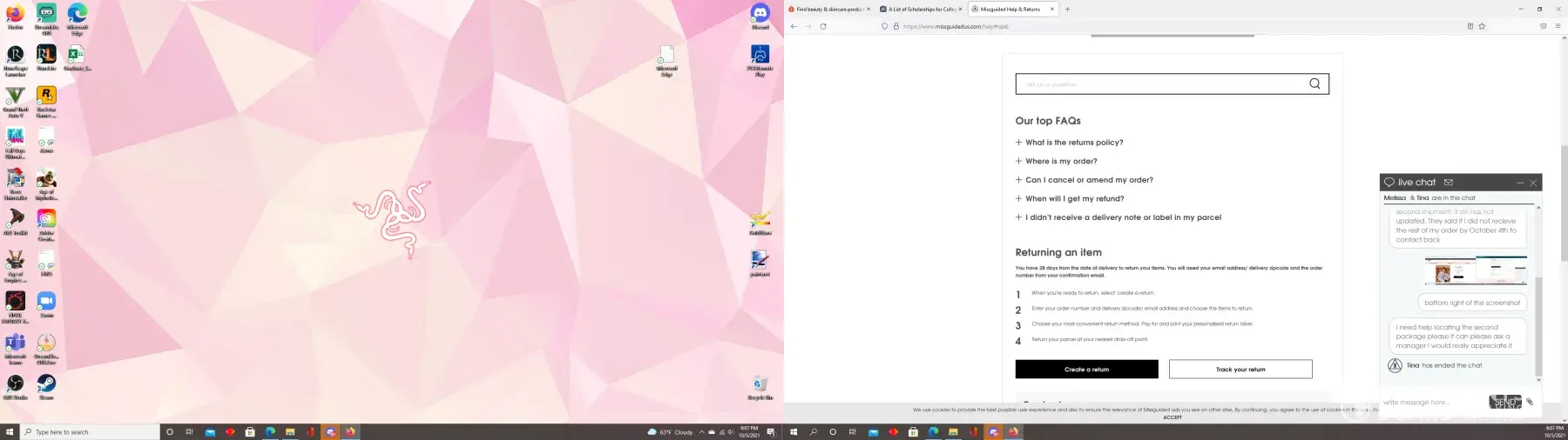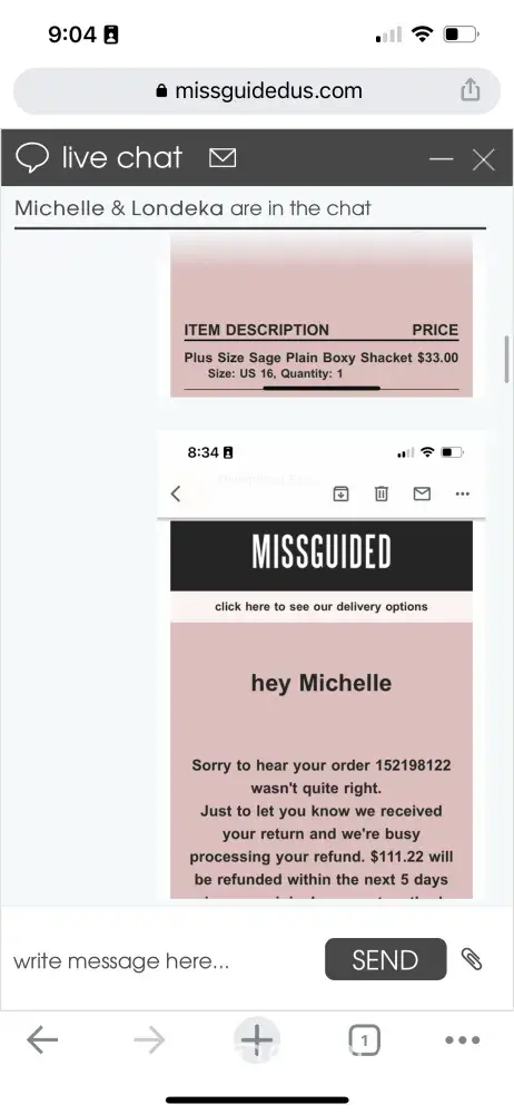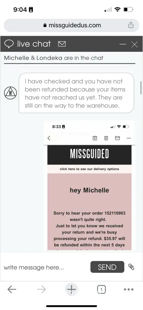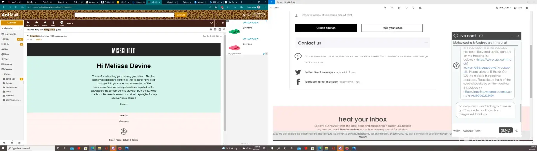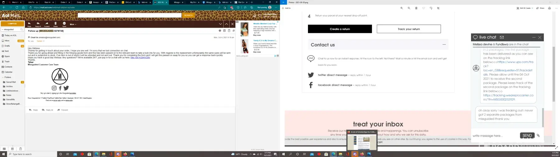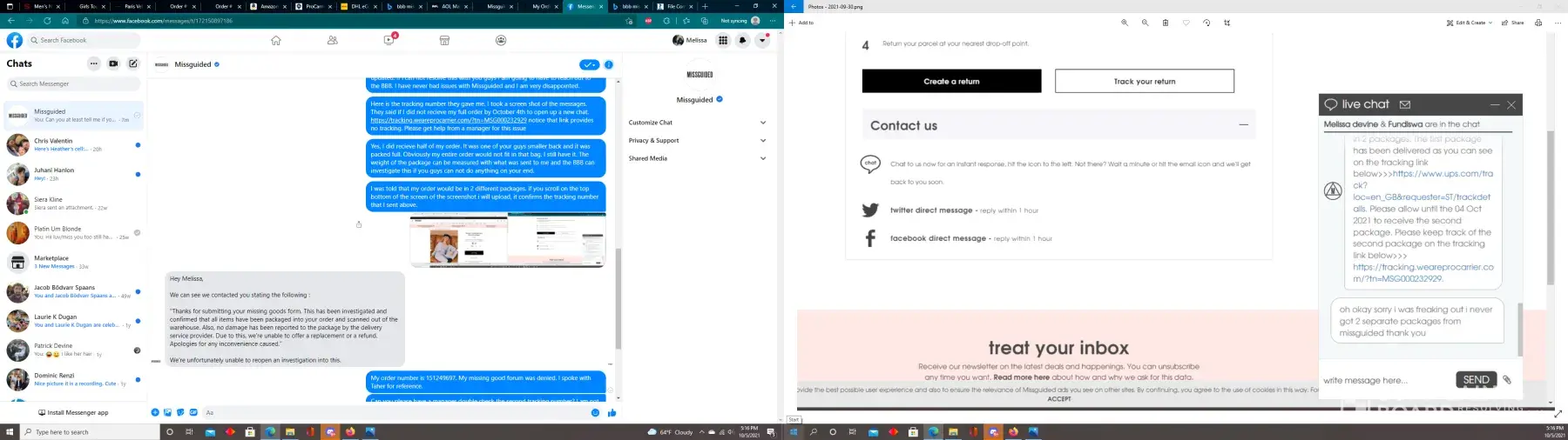 Update: I just contacted live chat on the Missguided US website and got representative Tina. I told her I needed help locating the second package and she ended the chat without writing back.