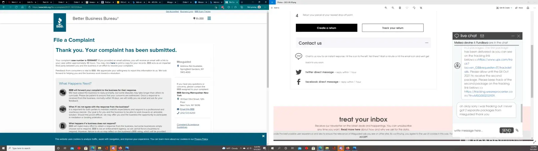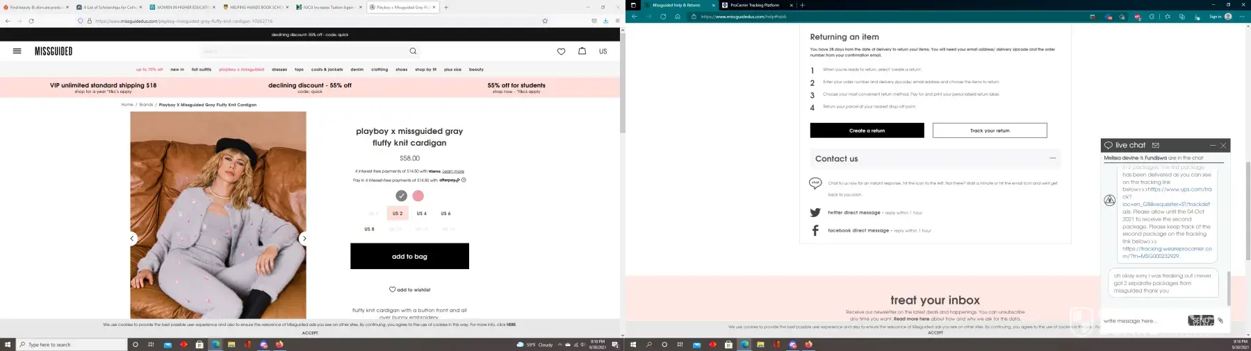 I ordered over $300 worth of merchandise from Missguided. My order number is [protected]. I only received half of my merchandise. I spoke with Fundiswa from live chat. They told me that my order was shipped in two separate shipments with two separate tracking numbers. https://tracking.weareprocarrier.com/?tn=MSG000232929 is the link that Fundiswa gave to me for the second shipment that I never received (the tracking number for this never updated). The first tracking number with items was delivered (so the entire order says delivered on the website). I believe this is why no one will help me. I did not receive the second half of my order. They said if I did not have my full order by October 4th to hop back in chat (bottom right on first screen shot attached). The tracking number never updated still. 10/4/2021 I spoke with Taher who I have an email from (attached). I was told to fill out a missing goods forum. I filled it out and it was declined (photo attached) I also reached out on Facebook and they said there was nothing that they could do as they can not reopen the missing goods claim. I would like for this matter to be investigated. The proof is in the package weight and the size of the package. It was in one of their smaller bags and it was packed to the brim. My whole package (over $300) would not have fit in there. The package says it weighs around 6LBS. I am not sure if this is correct or if this is fraudulent with the company as well. I am missing: playboy x missguided gray fluffy knit cardigan US 0 (out of stock, but I will take a size 2) playboy x missguided black cropped knit rugby sweater US 0 playboy x missguided green cropped knit rugby sweater US 0 playboy x missguided pink bunny all over print pajama set US4 playboy x missguided pink bunny repeat toweling shirt US 0 playboy x missguided green oversized knit cricket cardigan Please help! I never thought I would fall a victim of fraud to Missguided US as I had trusted their company until now. I tried to reach out to them for help and was denied. I did not want to reach out to other companies for help but this is my only option as Missguided will not help me. Their BBB reviews and comments under their IG page promote that this is happening to others as well.