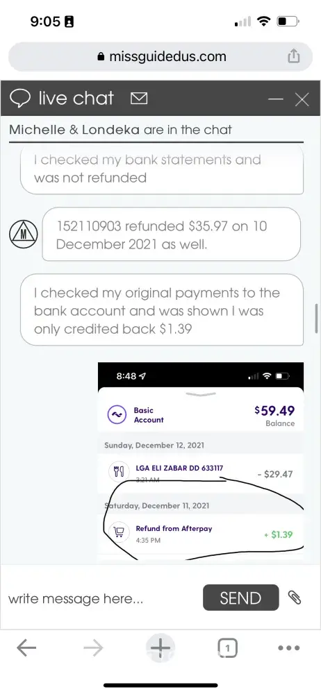 I sent her the screenshot of the emails stating that they did and was going to refund the money within 5 days (email was received Dec 10th, 2021 - today is Jan 4, 2022) she then said checked again and said I was in fact, refunded on the 10th (didn't you check the first time I asked?).