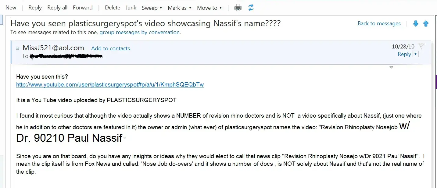 During this hot debate on this particular message board criticising PlasticSurgerySpot message board MissJ emailed me and told me that PlasticSurgerySpot message board uploaded a video clip on youtube which was created by Fox News. This clip by Fox News called, “Nose-Job do-overs”, featured three doctors: Dr. Paul Nassif who was my surgeon who left me unhappy, Dr. Dean Toriumi and Dr. Jack Gunther. -http://www.youtube.com/user/plasticsurgeryspot#p/a/u/1/KmphSQEQbTw
