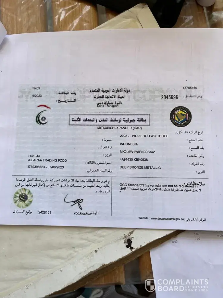 I have bought a vehicle (Mitsubishi Xpander 2023, Chassis No. MK2L6W1Y8PN002342, Motor No. 4A91430KBK0538), from your agent in United Arab of Emirates, who confirmed me that the warranty is applicable in my home country (Egypt), where I have dispatched the car (Cairo, Egypt), but unfortunately when tried to register the vehicle with Mitsubishi Egypt, they declined my right of the warranty, arguing that I didn't bought the car from them, subsequently I have a new Mitsubishi car with no warranty coverage?!