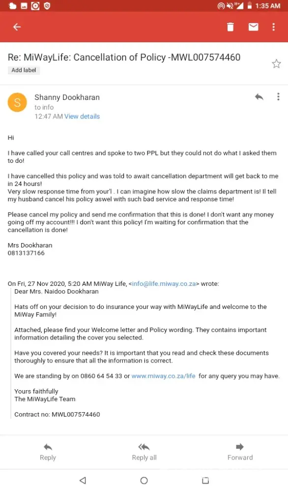 I have phoned the office over 4 times to cancel two of my policies that my husband and I took on the same day. They already debited our account even after requests have been emailed and telephonic requests to cancel policies MWL007574366 and MWL007574460, for Mrs Rebekah Rosanne Naidoo Dookharan and Christopher Dookharan.