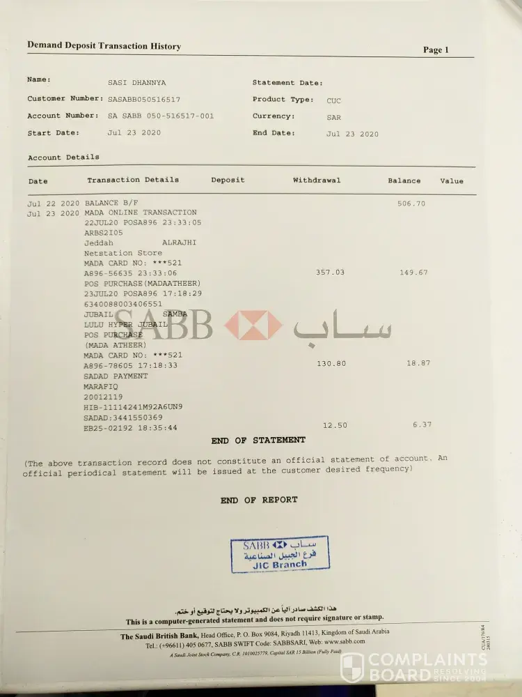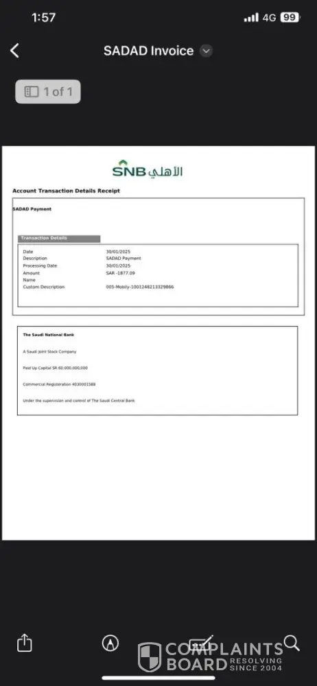 My name is Mahammad Rafeek Abdulla. I have been using a Mobily WiFi connection for the past two years under Account No. 1001249800830080. Approximately two months ago, I officially requested the cancellation of this service through Mobily customer care and the Mobily office. As instructed, I paid an amount of SAR 501, after which my outstanding balance wa...