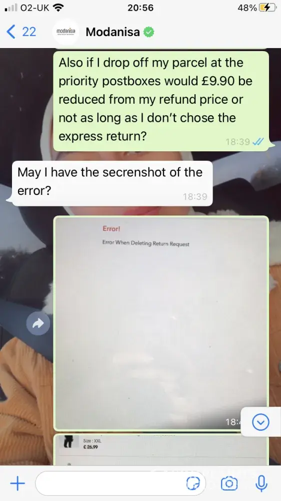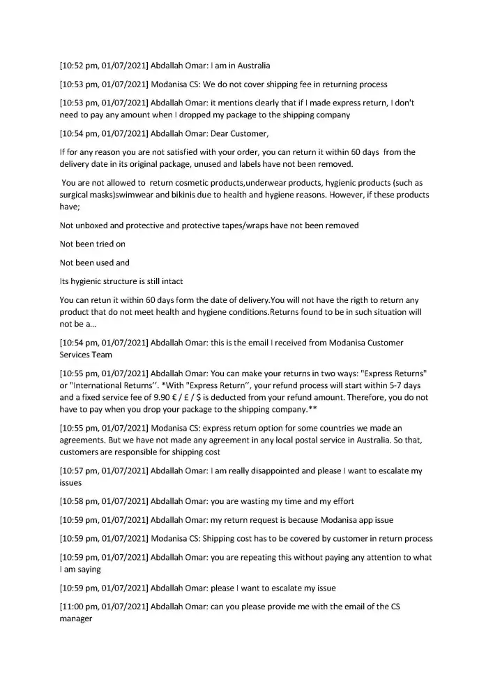 At the end I received an email from the CS team that mentioned that I could return my packages through express return with a fixed service fee of $9.90 which will be deducted from my refund amount and I don't have to pay to the shipping company when I drop your package. Therefore, I have done all the packaging and tried to find how I can do the express return on Modanisa website but I didn't find it. I contacted the CS team again through whatsapp and the CS rep. said that I am not eligible for the express return! which means that I have done all of the packaging for nothing. I was very disappointed because I wasted my time as a result of Modanisa again (this time because the CS team provided me incorrect information) Moreover when I tried to explain my dissatisfaction to the CS rep, he/she terminated the conversation after 2 minutes while I was writing! I even requested the CS rep. to escalate my issue and he/she ignored my request (please see my whatsapp chat for reference)