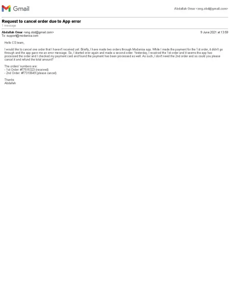 On the 1st June, I made an order through the Modanisa app. while I made the payment for the order, the app gave me an error message and didn't go through. So, I started over again, spent 4 days collecting my items again then I made the second order. After a while I received the first order which I wasn't aware of because the app didn't confirm the payment. So, I emailed Modanisa CS to cancel the 2nd order but they didn't respond.