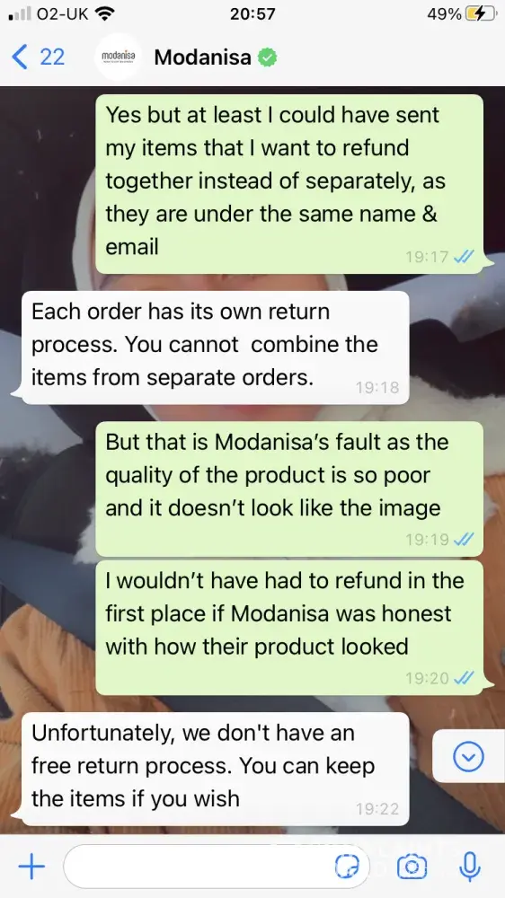 I ordered 3 burkini's, all of which had a satin material and are quite thin unlike in the images where it looks thick and elastic (as a swimsuit should be), When I came to refund the items I was informed that I had to pay £9.90 on each of my packages (two packages) although when I came to look at the product itself the refund policy wasn't there, anyways when I contacted customer service via WhatsApp, I asked if I could refund for free as the items are faulty and not as described, but was informed that this wasn't an option, then I asked if I could at least put the items together so I wouldn't have to pay delivery for each package and they still said no. If the quality of the burkini wasn't poor I wouldn't have requested the refund in the first place, so why am I paying the price for modanisa's mistake. Also on their website it says that they have a warehouse in the UK which when I asked customer service where this was I was told that there isn't one, so if there isn't one why would you put misleading information on the website. I would like to refund all three items with no delivery fee.