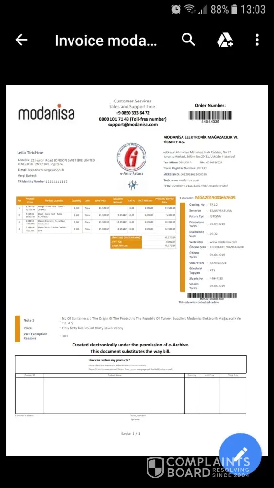 Extremely bad customer service and poor attention to customer complains. Application of online shopping is misleading the customer and it didn't give mention of customs fees despite modanisa team is fully aware about it. I made my order and paid by credit card on 11 jan2019 but mu purchases didn't reach up to date due to being stuck at customs. Modanisa customer service were very rude and not helpful. Info of customs was not mentioned at time of cheking out the basket. I refused the shipment since more than two weeks and my money didn't credit back. I called call center and raise complains over emails several times but unfortunately without any response or fruitful action