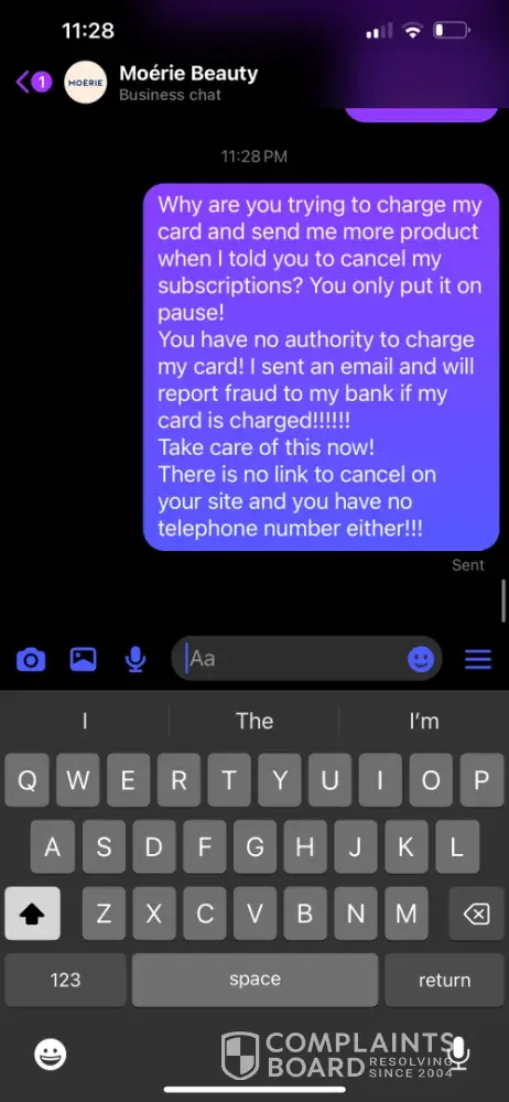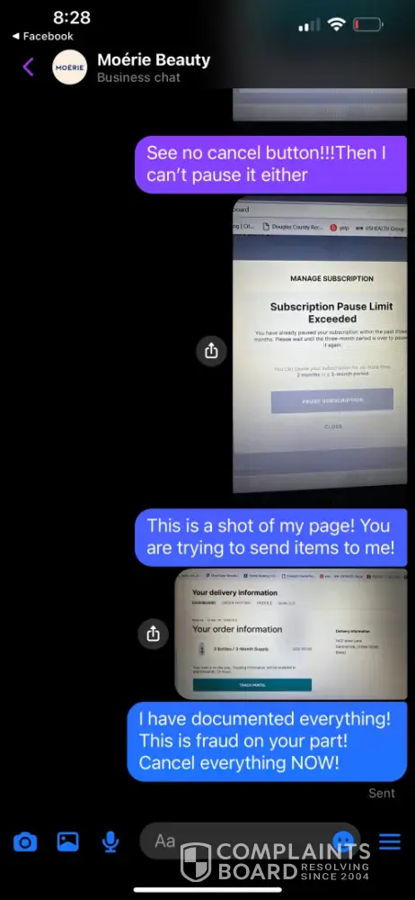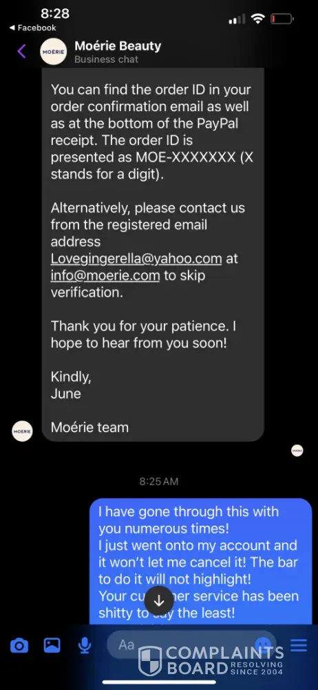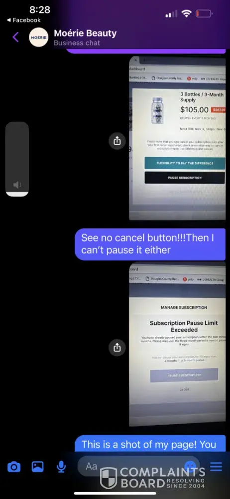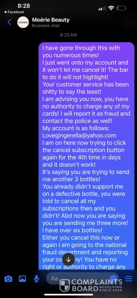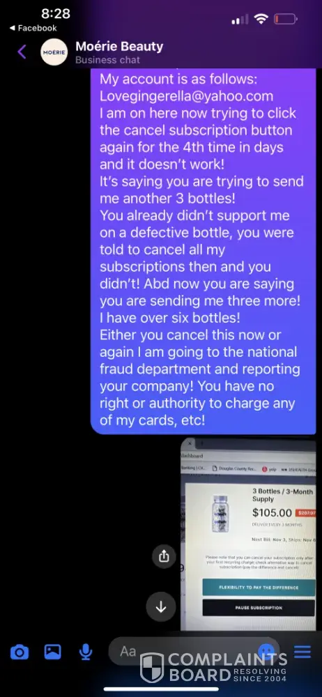 I sent an emails and Facebook messages to Moerie requesting a cancellation of my subscription. for some reason they had me set up with two subscriptions to the same product. After my first order, I got 3 bottles sent to me then a few days later I got 9 bottles sent to me! I contacted them in July 2024 to cancel both subscriptions! I thought this wa...