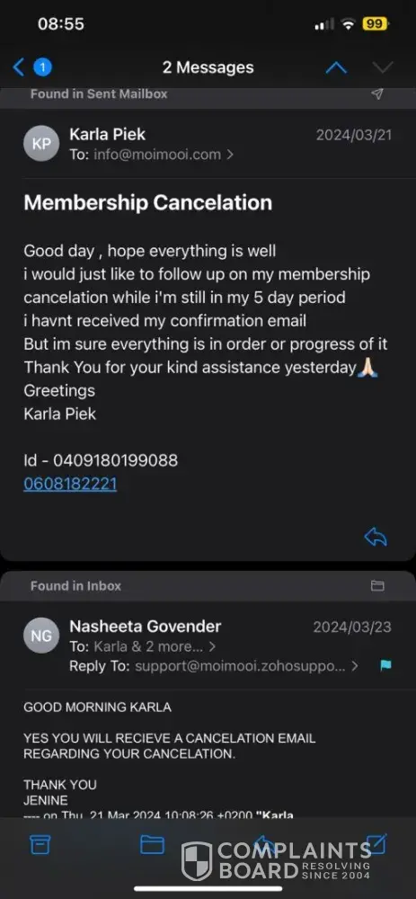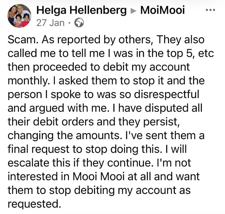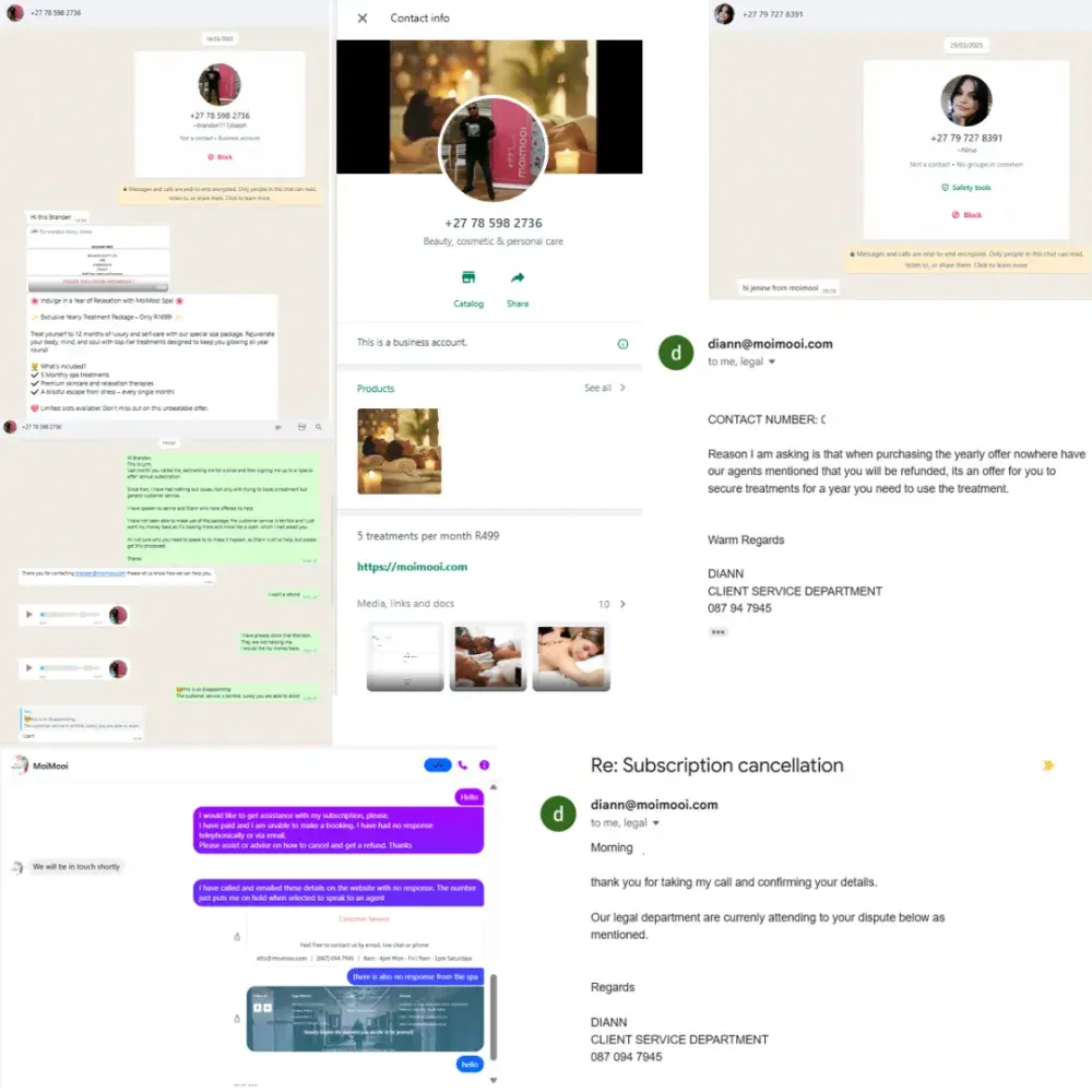 Hi Tbjs may have been a while back but this is how long I've been chasing my refund. I've canceled my membership back in September 2019 (still have proof) and even after that moimooi have scammed me as stolen my money from my account every month for 4 months after.I actually think they are a bunch of criminals and their company needs to be closed down. They have take R2500 from me after my membership was canceled and I've been chasing them ever since to get my money back. I was back and fourth with a person named Diane Sumerton and Angelique (don't care what the [censored]es surname is) they both threatened me with a lawsuit and bare in mind they are the criminals. I was told by my aunt who went all the way with them and got her money back, that Diane Sumerton actually does the debit orders at home from a card machine. Now if that's not criminal or suspect then I don't know. I still have not received my money back, I'm still R2500 short on my overdraft in my bank account that after years are still chasing me for and still have not has a resolution. Apparently there is new management but the same thing still seems to be happening to other people based on Hello Peter reviews and more criminals have taken over. I'm struggling to understand why this business is still standing. I have all the emails, the back and fourth, between myself and those people. They are criminals and need to be shut down. They don't realize what God is going to do to them. Diane and Angelique should be lucky Im not a criminal and go look her up their home addresses and take their [censored] out of their homes.