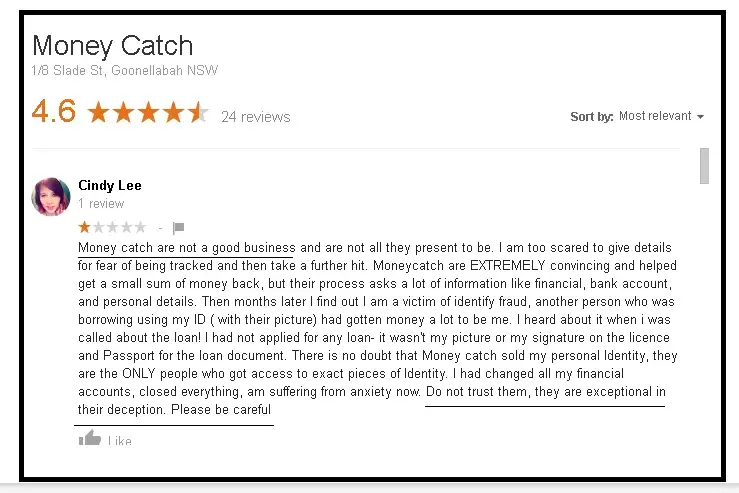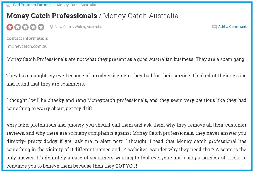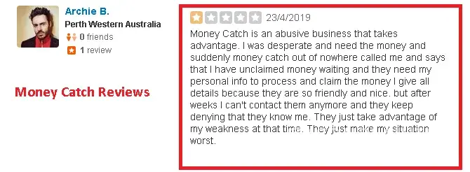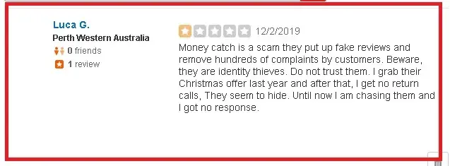 A few days later they called me again I pretend I am interested and asked a lot of questions about their business and so on. I said I will only give my information if they answer all my questions, I asked them about people telling that they are a scammed I gave names of people I found here https://www.trustedbusiness.reviews/business/money-catch#popup1 / https://dirtyscam.com/reviews/money-catch/ / https://www.yelp.com.au/biz/money-catch-goonellabah-2 the person pause for 5 seconds and end the call.