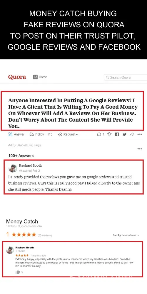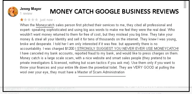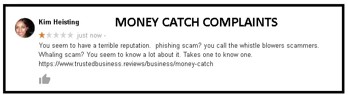 I wanted to bring to light a crime syndicate called money catch. This criminal syndicate presents as a business, it approaches individuals asking the 'assist' you in accessing mythical large sums of money. They are after your money and want to steal your identity and financial details. The individual is understandably sceptical about being approached. Money Catch owner comes across as the ultimate professional, from the well-worded website to her well-crafted emails and they point to the countless happy customers with positive on facebook and google. Money catch owner reminds me of a slimy octopus with tentacles everywhere. The positive reviews are fake, they buy them from facebook review sellers and via a site called Quora see proof as attached