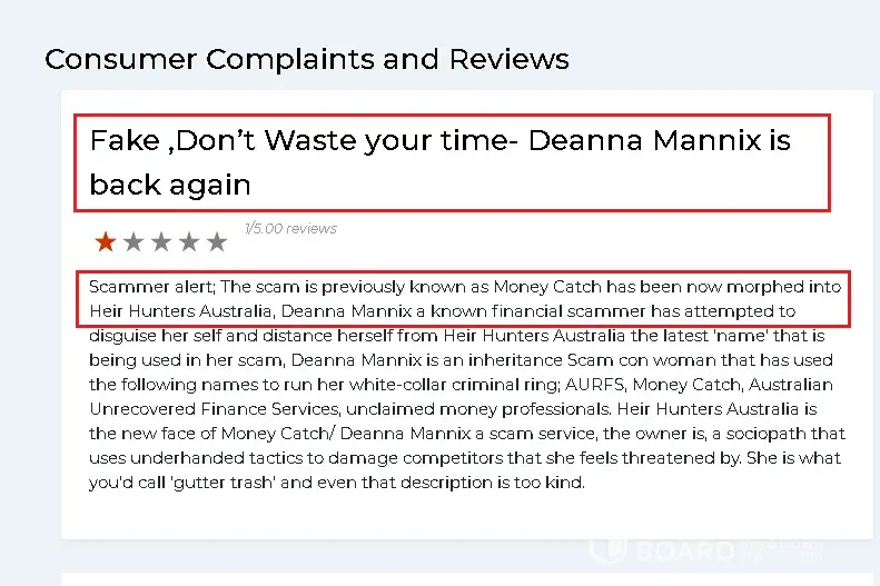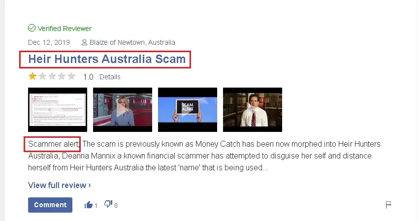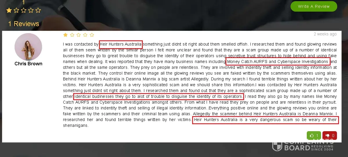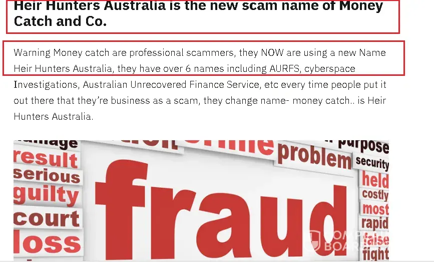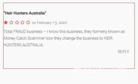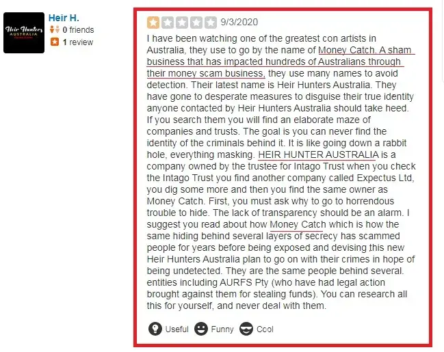 I have been watching one of the greatest con artists in Australia, they use to go by the name of Money Catch. A sham business that has impacted hundreds of Australians through their money scam business, they use many names to avoid detection. Their latest name is Heir Hunters Australia. They have gone to desperate measures to disguise their true identity anyone contacted by Heir Hunters Australia should take heed. If you search them you will find an elaborate maze of companies and trusts. The goal is you can never find the identity of the criminals behind it. It is like going down a rabbit hole, everything masking. HEIR HUNTER AUSTRALIA is a company owned by the trustee for Intago Trust when you check the Intago Trust you find another company called Expectus Ltd, you dig some more and then you find the same owner as Money Catch. First, you must ask why to go to horrendous trouble to hide. The lack of transparency should be an alarm. I suggest you read about how Money Catch which is how the same hiding behind several layers of secrecy has scammed people for years before being exposed and devising this new Heir Hunters Australia plan to go on with their crimes in hope of being undetected. They are the same people behind several. entities including AURFS Pty (who have had legal action brought against them for stealing funds). You can research all this for yourself, and never deal with them.