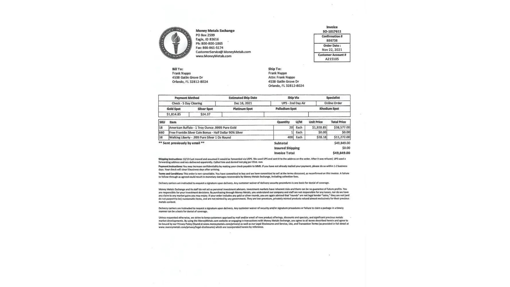 Money Metals Exchange sent an order of silver and Gold to an address on November 22 2021 which I moved from UPS had returned it to their distribution center and proceeded to send it to another address which was a bogus address in the same city. Money Metals refused to file a claim with their insurance company due to me not receiving the order they refused saying that it was delivered to an address which I didn't live at.