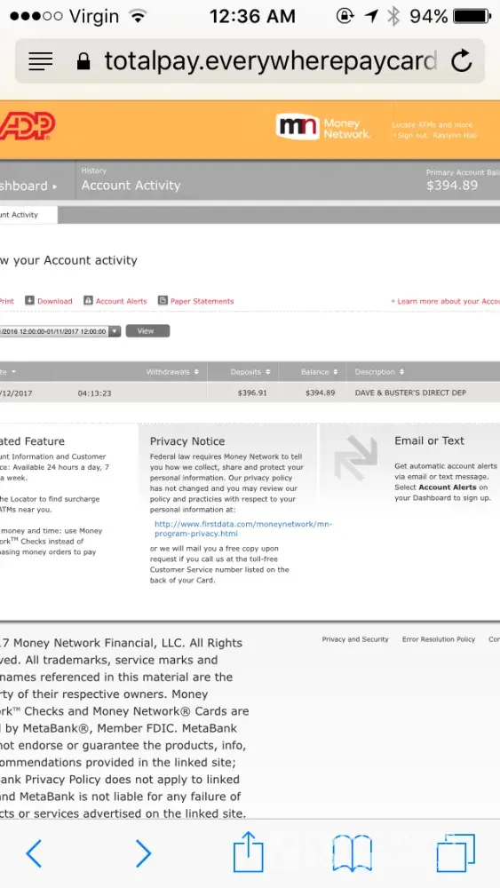 The company is not releasing funds earned through employment at Dave and Busters. They required copies of drivers license, SS card, birth certificate, and a signature. Once provided, they still did not release the funds claiming the address on the license was not the same as what they have on file.
