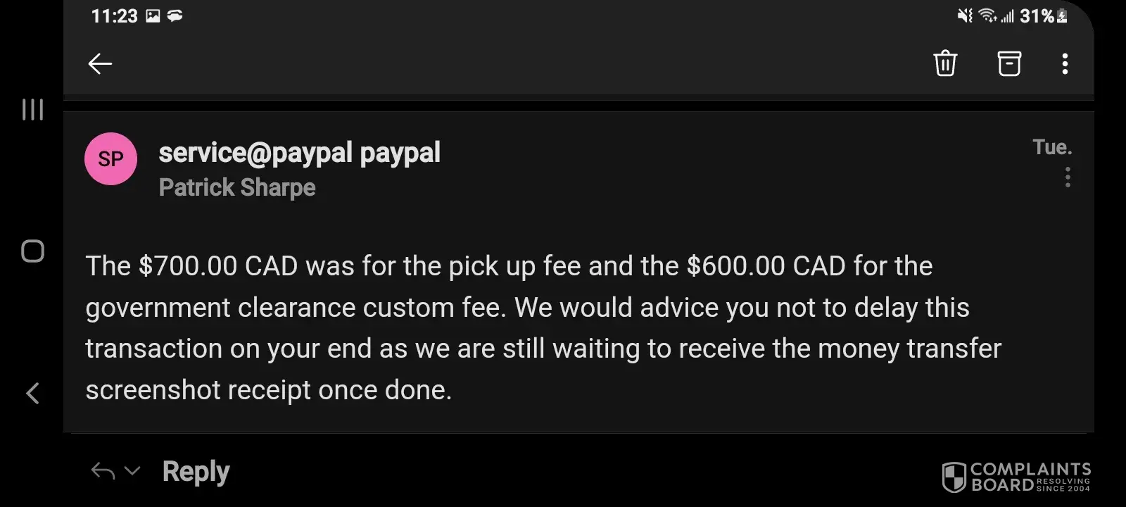 Note: We want you to understand that your buyer is ready to pay for all the charges that were requested but can't send money directly to her pick up agent because she only have funds in her PayPal account which we also know about, because of this is the safest way to make transactions on the Internet. And as soon as we contacted her about this issue she sent the payment immediately to your PayPal account which makes the money you will receive in full a total of $2, 300.00 CAD