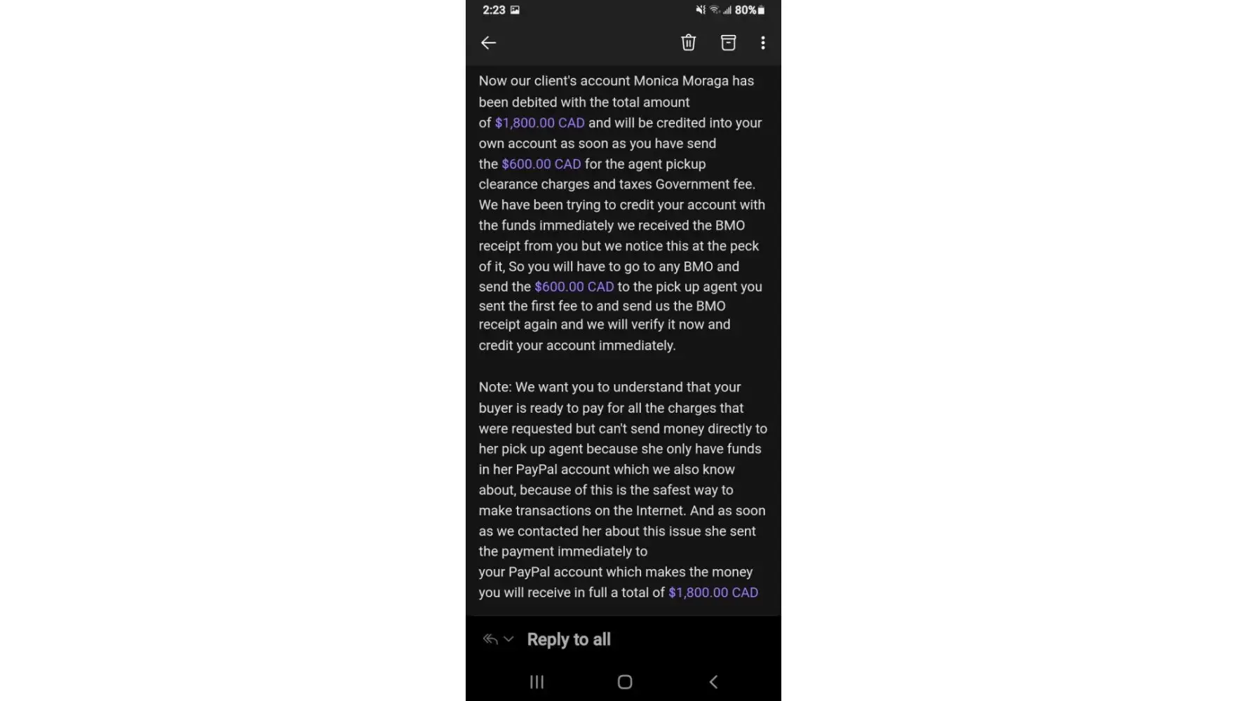 I do the same as I know they are scammers...don't use PayPal or accept a certified cheque etc. Cash or emt in Canada that's it