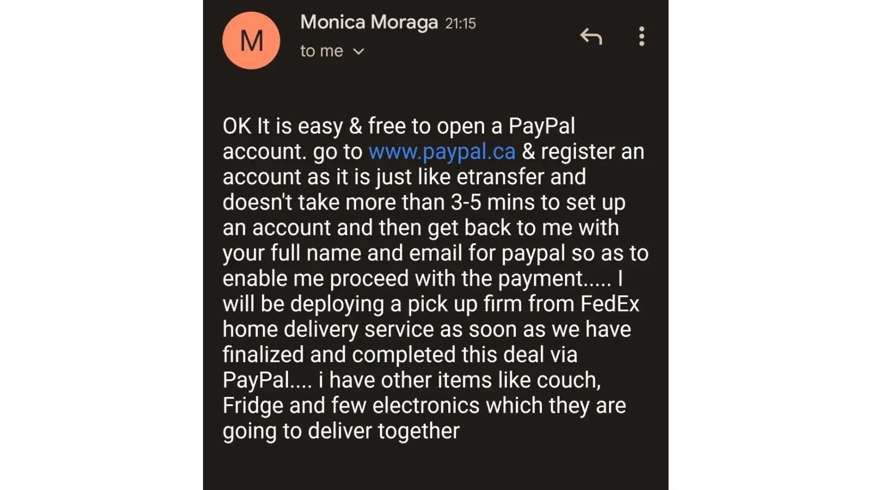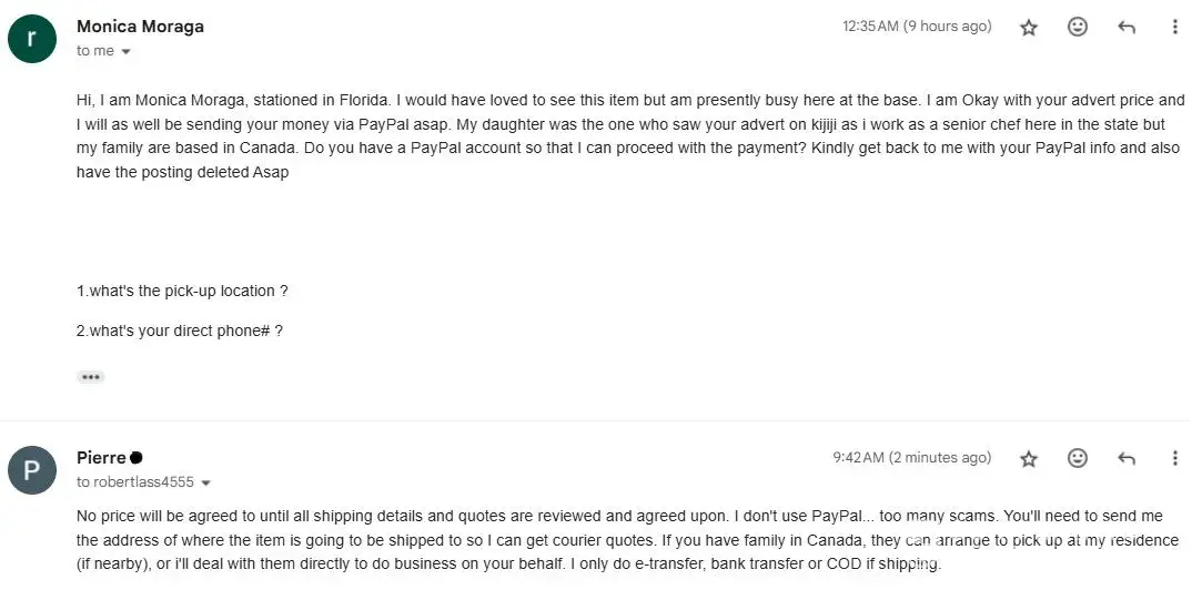 i just got same message for a stroller i have on kijiji. it was sent as a text to give direct email "cos" i get charged when i text or email my mom. moniccamoraga@gmail.com so i dont have paypal acct i replied to see if they could e transfer becasue little info for auto deposit is ok for me paypal charges fees. so waiting i decided to check the email address and it brought me here. i am sad because i got hopes up there being in money dispair between myself and toddler daughter so i really cud have used this sale so so much. i just wanted something to go my way and then this scam... how does this one pick its victims out do i put a "hey you over here i want to be scammed out of money i dont have lol pick me pick me pick me or is it randomly sent to unknowns to see who bites on it?