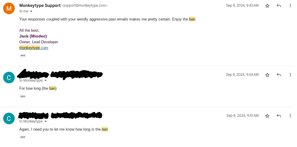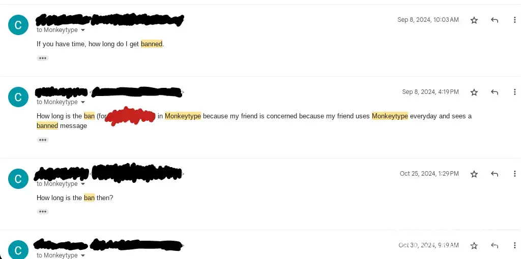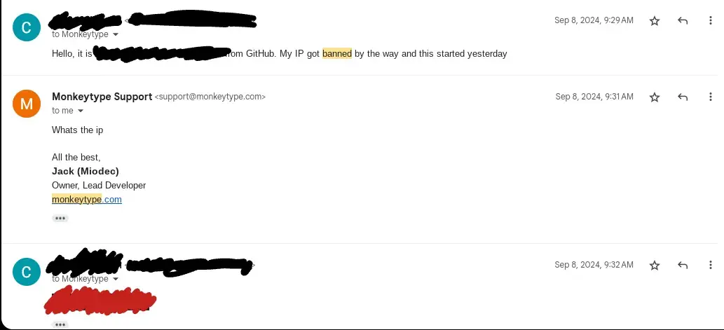Hello! In 2024, Monkeytype (the website https://monkeytype.com) banned me from using Monkeytype without a reason. The ban is my IP address, not my account. It doesn't say a reason why I was banned and does not mention how long I was banned. However, I did contact support (by email) but they never responded. Here is the response from what is happening here...