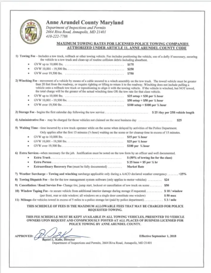 Hi, I live in anne arundel county as well and I believe you are confusing the "police requested" tow rates with the "maximum allowable tow fees in Maryland" ... they are two different fees. The tow fee document you posted is for POLICE REQUESTED towing fees, ie; what the police tow companies can charge when the police request a tow. What a tow company can charge in maryland is much higher at $350. per tow, plus storage.