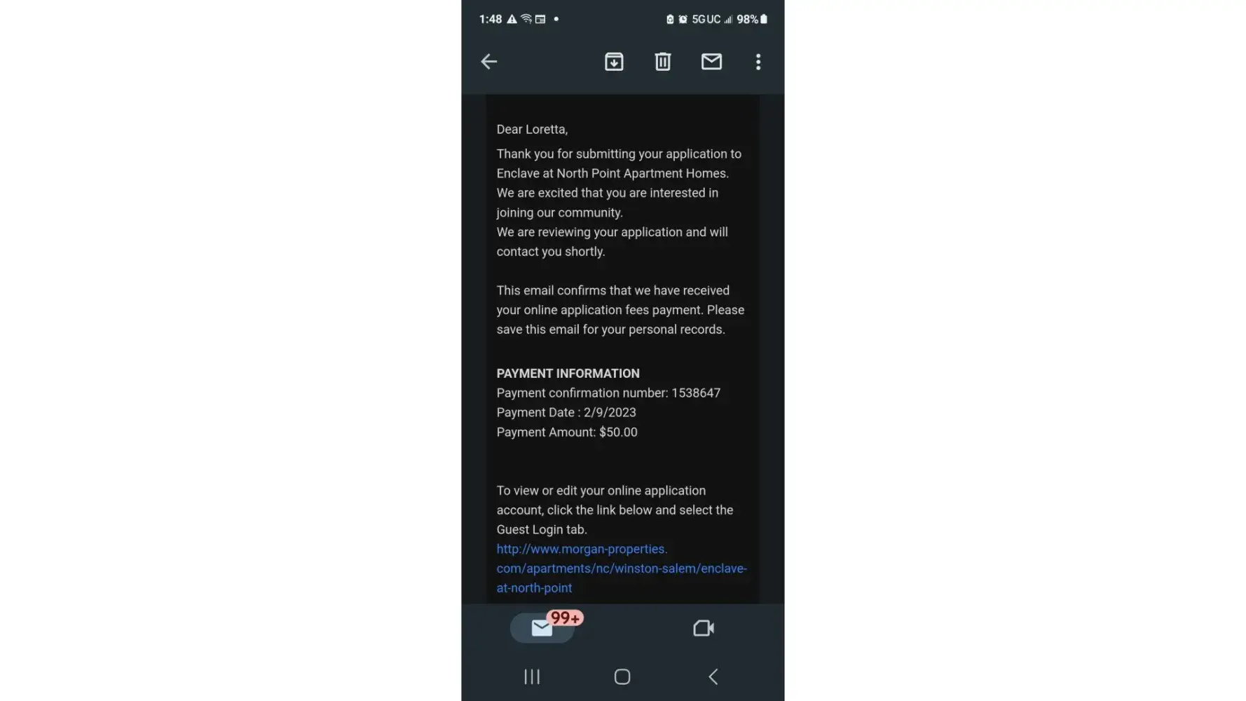 Desired outcome: I would like for the $50.00 to be transferred to the new application and the issue be resolved Monday.